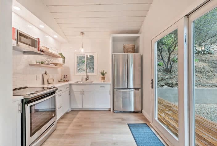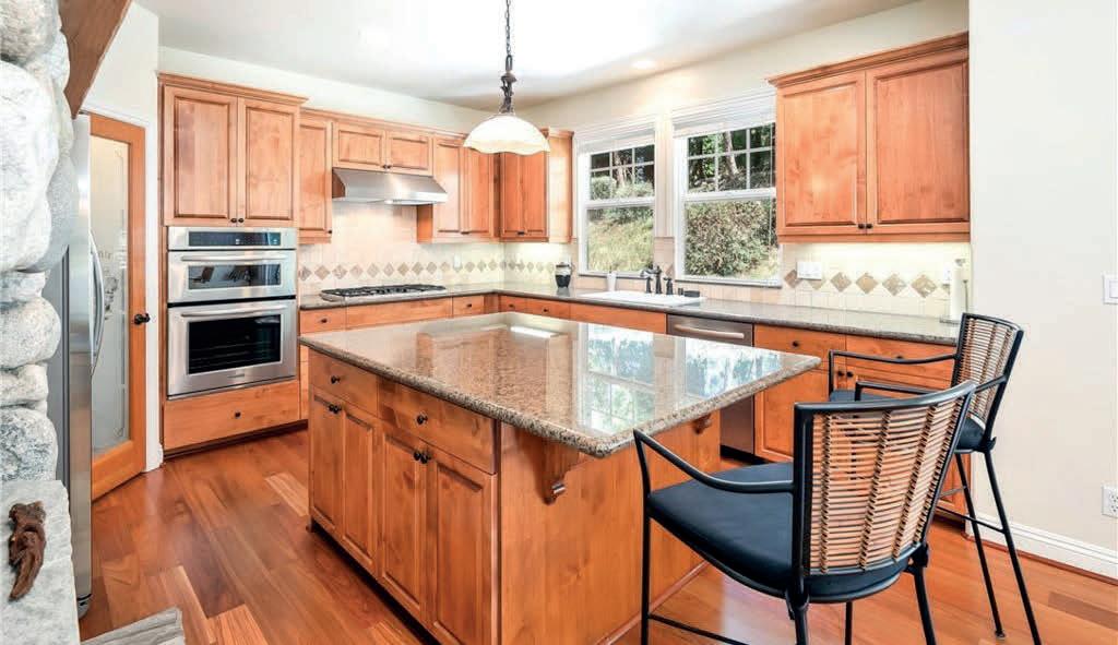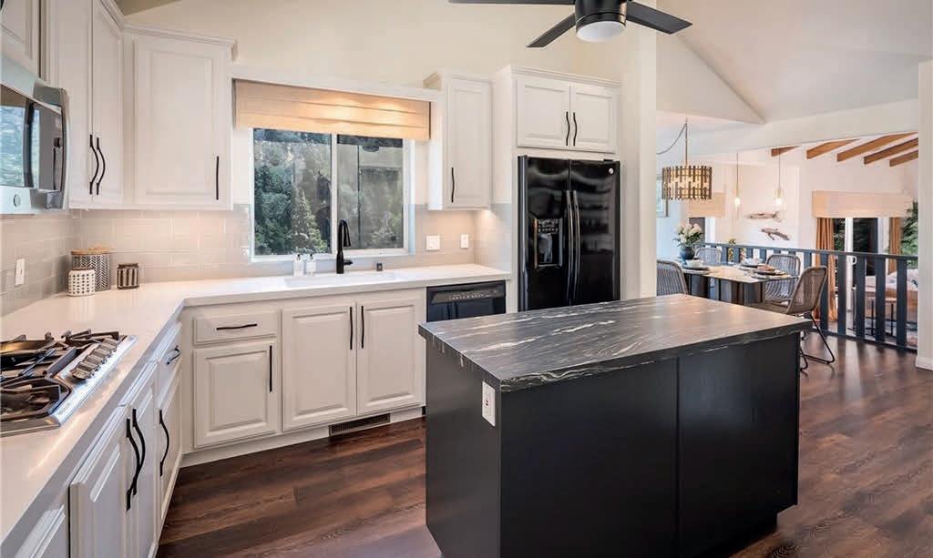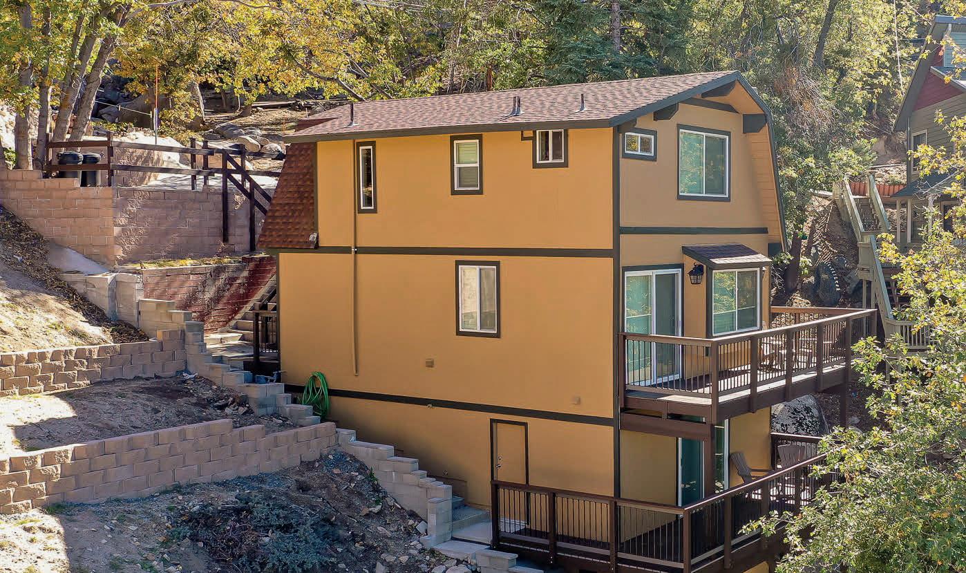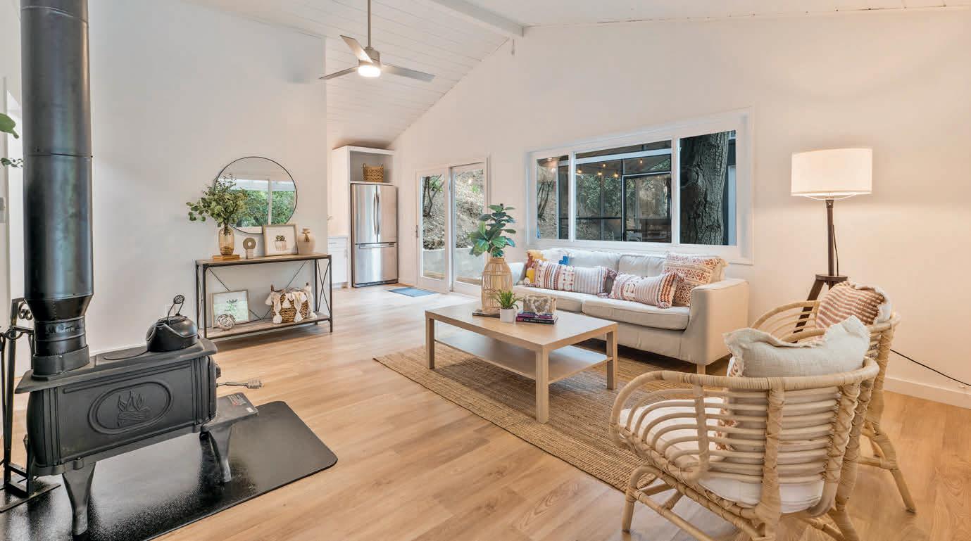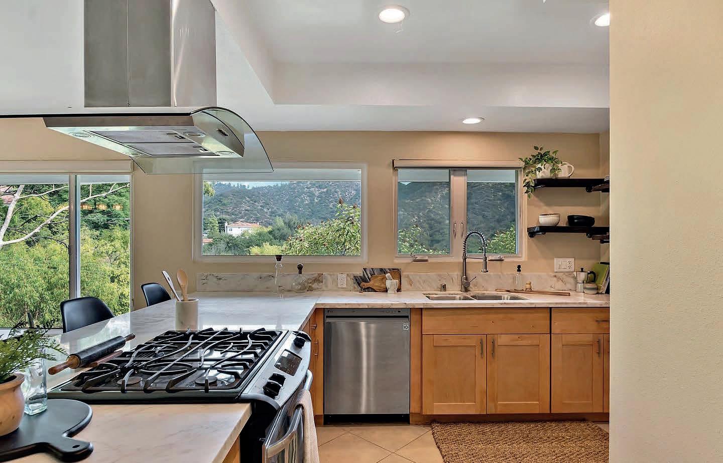 This exceptional 3-bedroom, 1.5-bathroom home sits on 5 lots commanding exceptional views of the San Gabriel mountains. Beginning in 2018, this home was completely renovated, stripping the original interior structure down to studs and adding an additional bedroom and half bathroom to the original 2-bedroom, 1-bathroom structure. All work was fully permitted and approved. The floorplan is three-stories, making the home feel spacious and providing easy accommodation for guests. Solid Brazilian Cherry hardwood flooring, exposed beams and tongue-and-groove ceilings, and new dual pane windows and sliding doors are found throughout. Entry is via the main level. The open kitchen has a large island, solid marble counter tops, undermount stainless steel sink, solid wood cabinets, soft close drawers, stainless-steel appliances, and breakfast bar space with stools. The dining area sits between the kitchen and living room, perfect for entertaining. The living room has wood stove, bay window and deck access showcasing the amazing forest with mountain views.