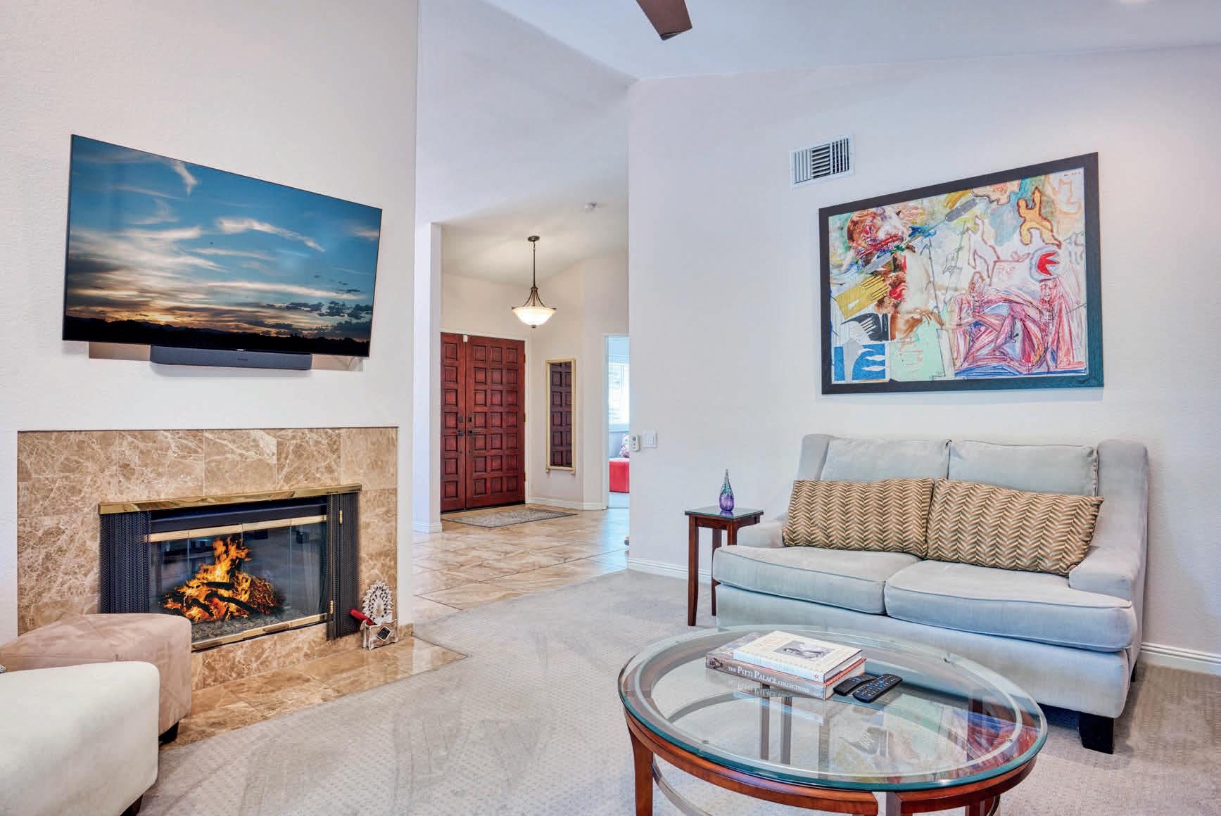Welcome to this owned Solar powered, open floor plan home with 4 bedrooms and 4 baths including an attached but separate entry casita and powder. The fee land, NO HOA home focuses around the great room with stainless steel appliances, large kitchen with granite counters, oversized island with seating, a separate pantry, raised hearth fireplace extra ceiling can lighting and a dining ell all overlooking the pool and spa. Also featured but not limited to, is a separate formal dining room currently being used as an office, freshly painted interior plus porcelain tile and plush carpet only in the bedroom, surround sound inside and out, owned whole home water softener | filter system as sell as an owned security system and a dedicated laundry room. Window coverings include plantation shutters, blackout and decorative drapes. The pool as well as the HVAC systems and water heater were updated in 2017. The pool includes a 2019 variable speed filter pump and plenty of time on the 10 years warranty on the pebble tech finish. The 2 guest rooms are of ample size & share an attached bath. The generous master suite is ensuite, with a large walk-in closet and direct pool access. The exterior is just as updated and maintained as the interior with a gas fireplace focused conversation area, gas plumbed BBQ area and bar seating, as well as a covered outdoor dining area with misting system all around the raised spa with waterfall spill into the pool.