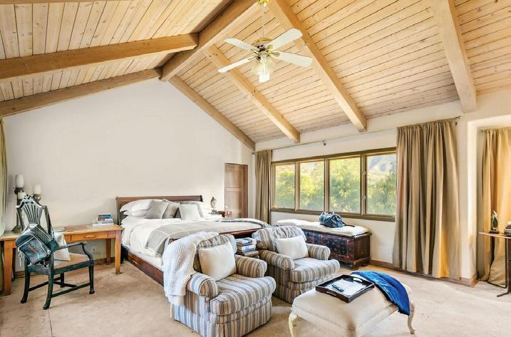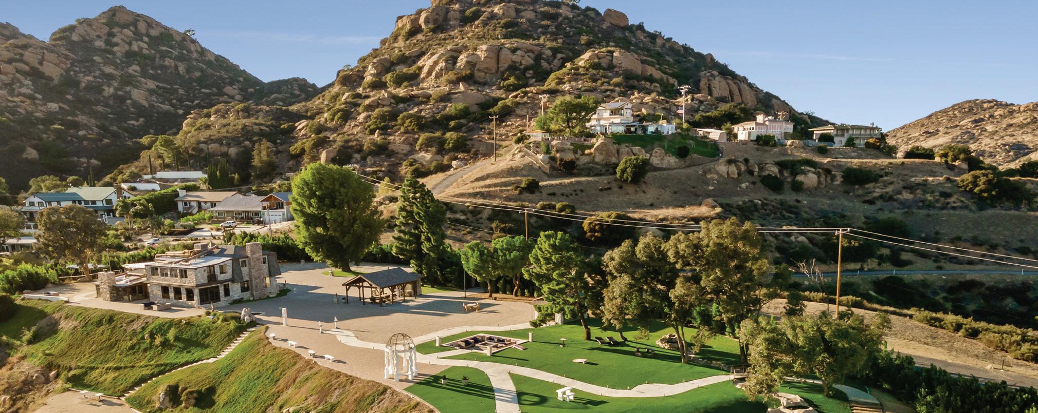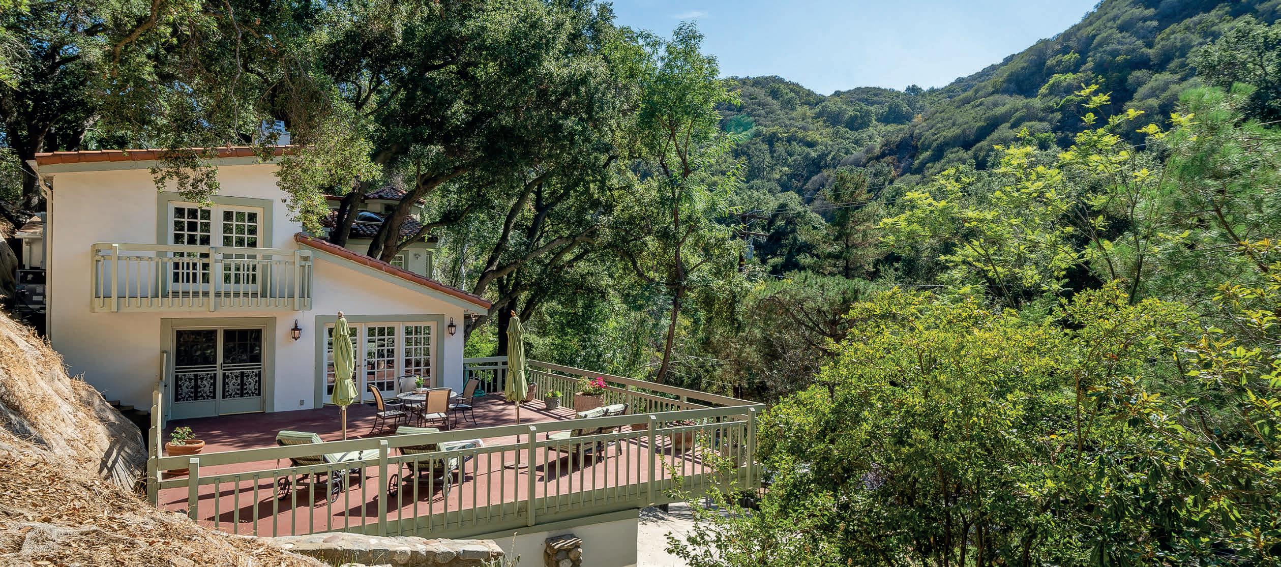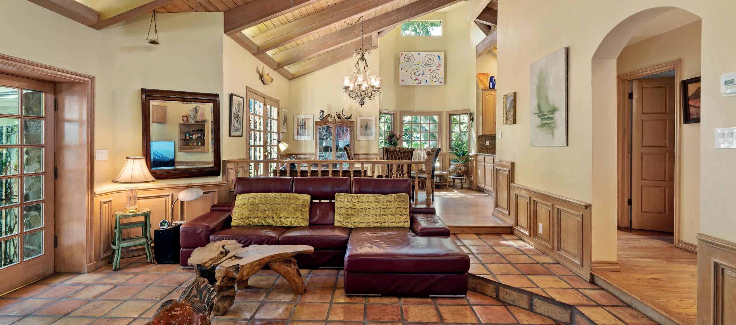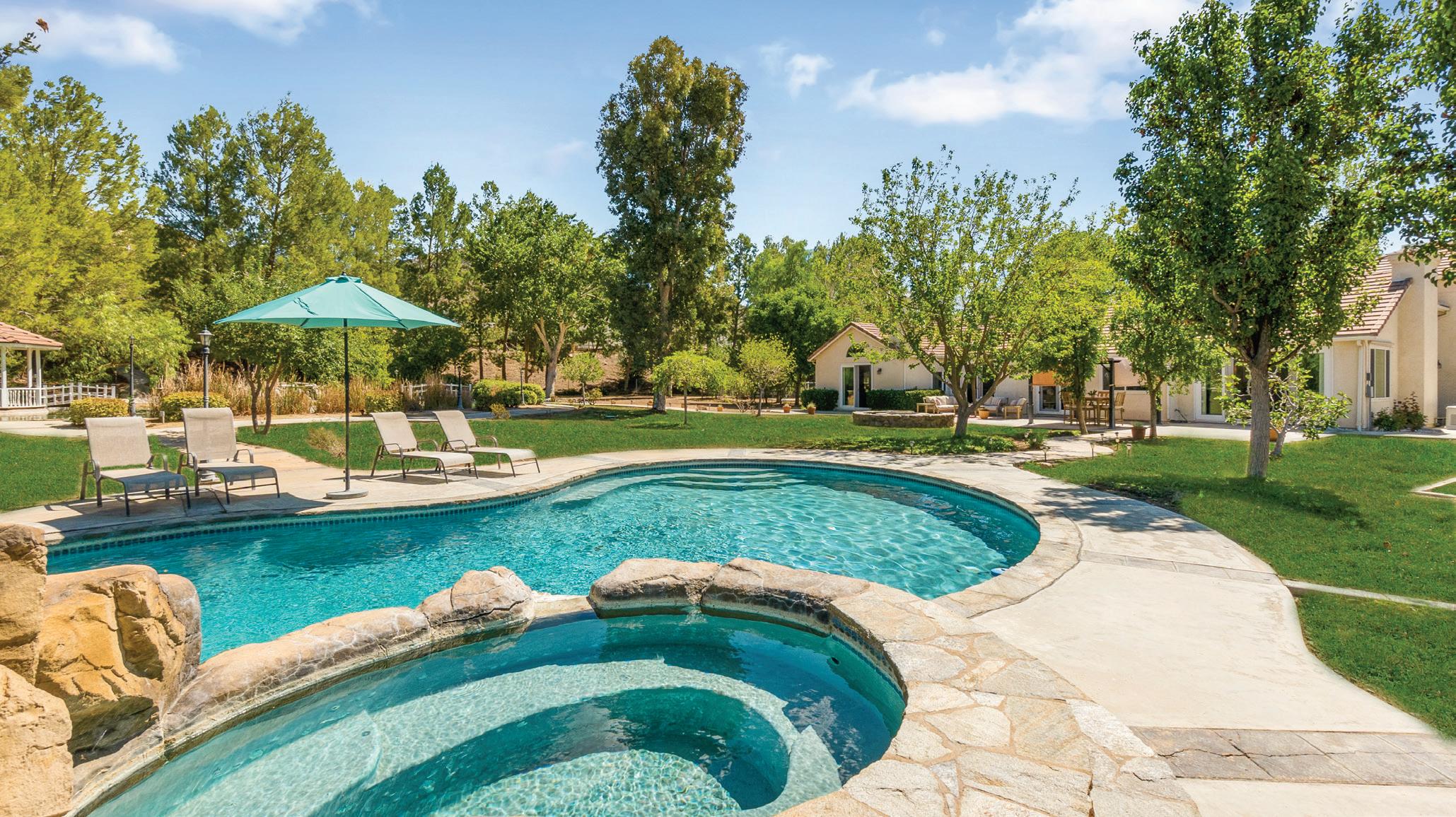 Royal Oaks Ranch – 5 gated, private acres close to downtown with wrap-around porch, 5 bedrooms, media room, wine cellar with tasting room, library, gym/massage room, 4 fireplaces, pool and spa, sauna, family orchard, olive tree orchard with approximately 30 trees, Bocce court, putting green, volleyball court, chessboard, gazebos, pasture, private well, 150-year copper roof, copper gutters, RV parking with hookups, sixcar garage and workshop, and more. RoyalOaksRanchOjai.com