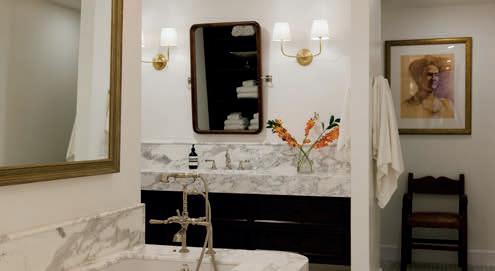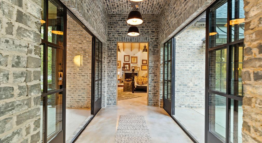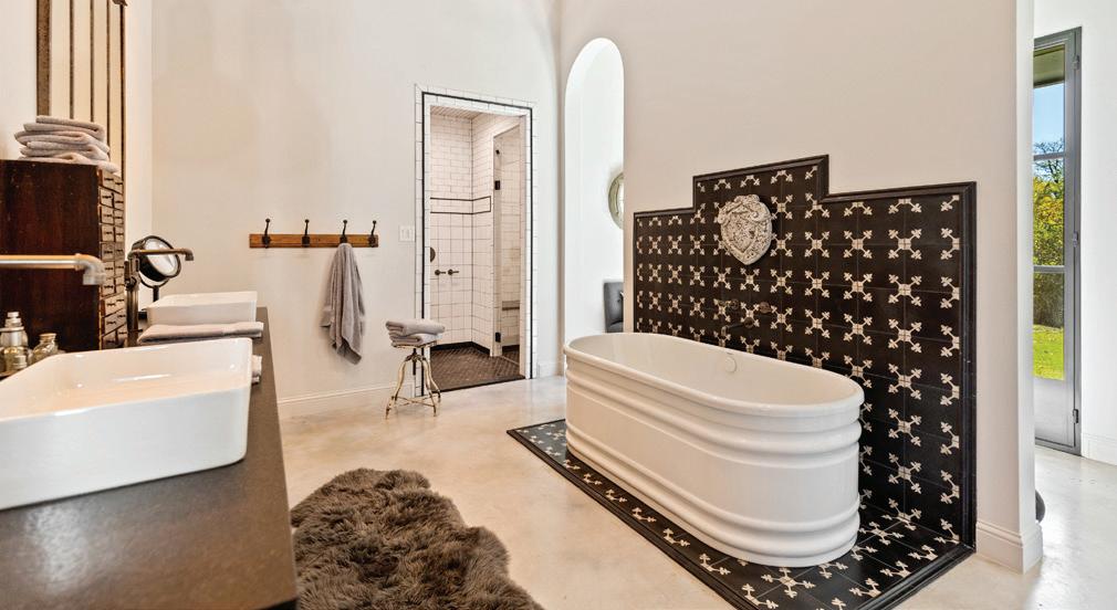 The master suite celebrates the good life and the art of living well. A luxurious spa-like building connected to the main house through a steel greenhouse hallway. Immediately the venerable patina of the aged flooring and 17th century bluestone fireplace brings a peaceful rest. Reclaimed from a bakery in the Cotswolds, a leathered black granite topped vanity adorns the master bath. 4 industrial shower heads adorn the generous space with access to a steam room. Timeworn encaustic French tile and stone coat of arms hug the industrial tub space.
