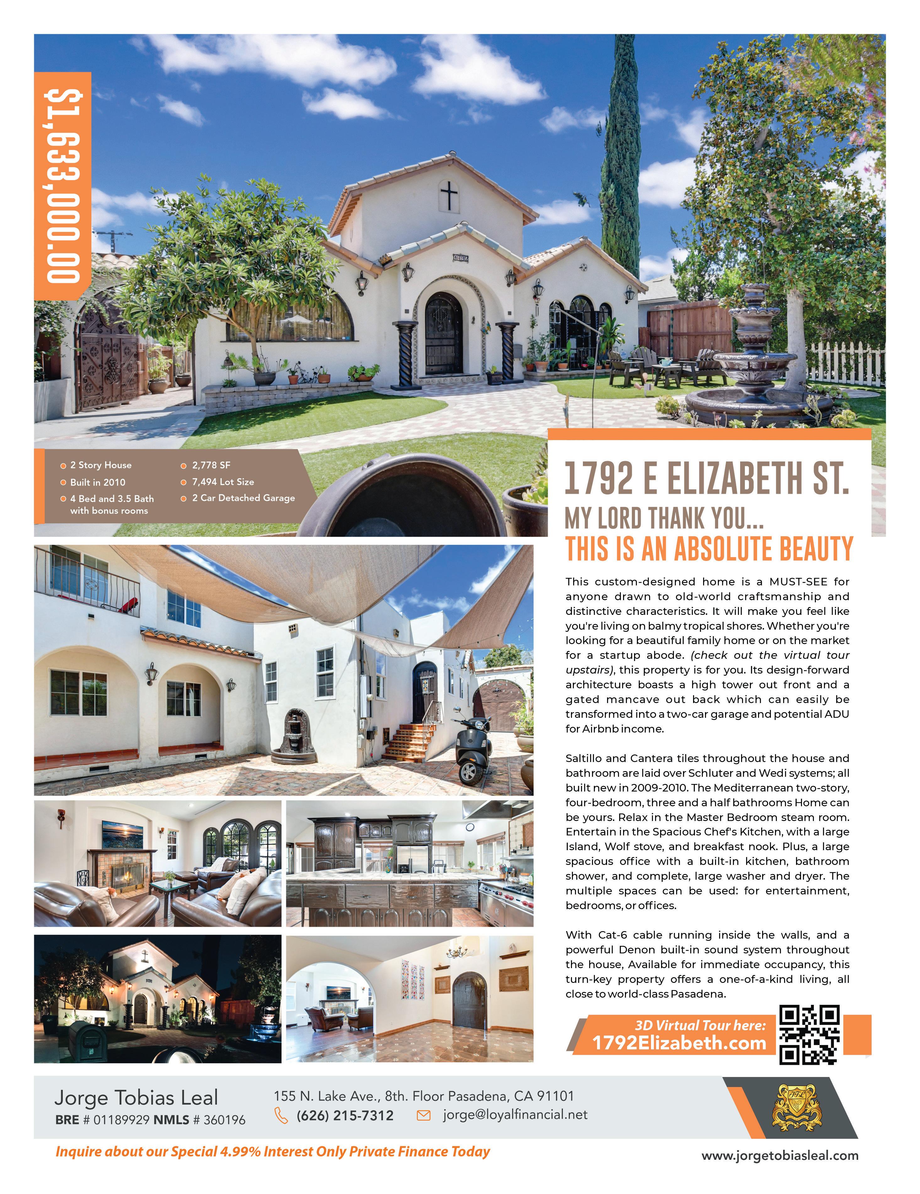 4 beds | 3 baths | 3,184 sq ft | $3,200,000. San Pasqual’s finest GEM on the market. Located in one of the most beautiful neighborhoods of Pasadena, this Spanish Revival is equipped with all of the features a discerning buyer would want. Surrounded by exquisite handmade wrought iron fencing and gates and the most beautifully manicured grounds is this stunning four bedroom, three bathroom estate. This home has been meticulously updated while keeping its old world charm. Chef’s kitchen with brand new Dacor appliances, quartz countertops, extra large island, Italian flooring and wall tile as well as custom cabinets with soft closing drawers. All three bathrooms have been fully remodeled with the finest materials. New Teak hardwood flooring in the downstairs living areas. Soaring, beamed ceilings in the living room and master bedroom.