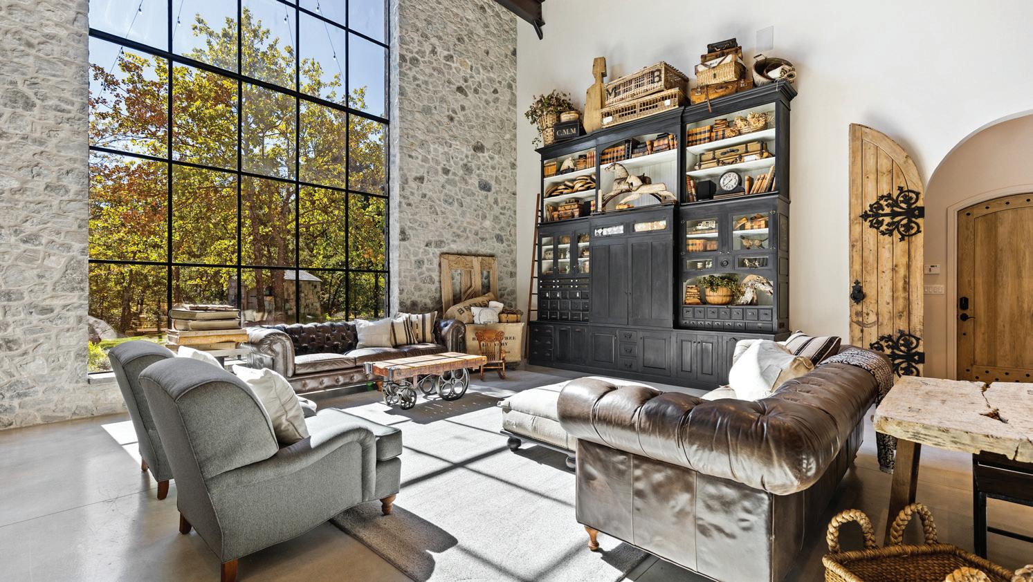 Steel windows and doors continue to give an industrial vibe. Including a 20 foot custom window overlooking the wooded terrain beyond. The marriage of old world design with carefully selected local materials is inspirational. The home boasts a 17th century Louis the XVII limestone fireplace mantle, 25 foot open rafter ceiling, a stone carved arch dating back to 1780, 35 restored factory lights from Belgium. All this is softened with warm aged 100 year old reclaimed doors from France, Belgium and England.