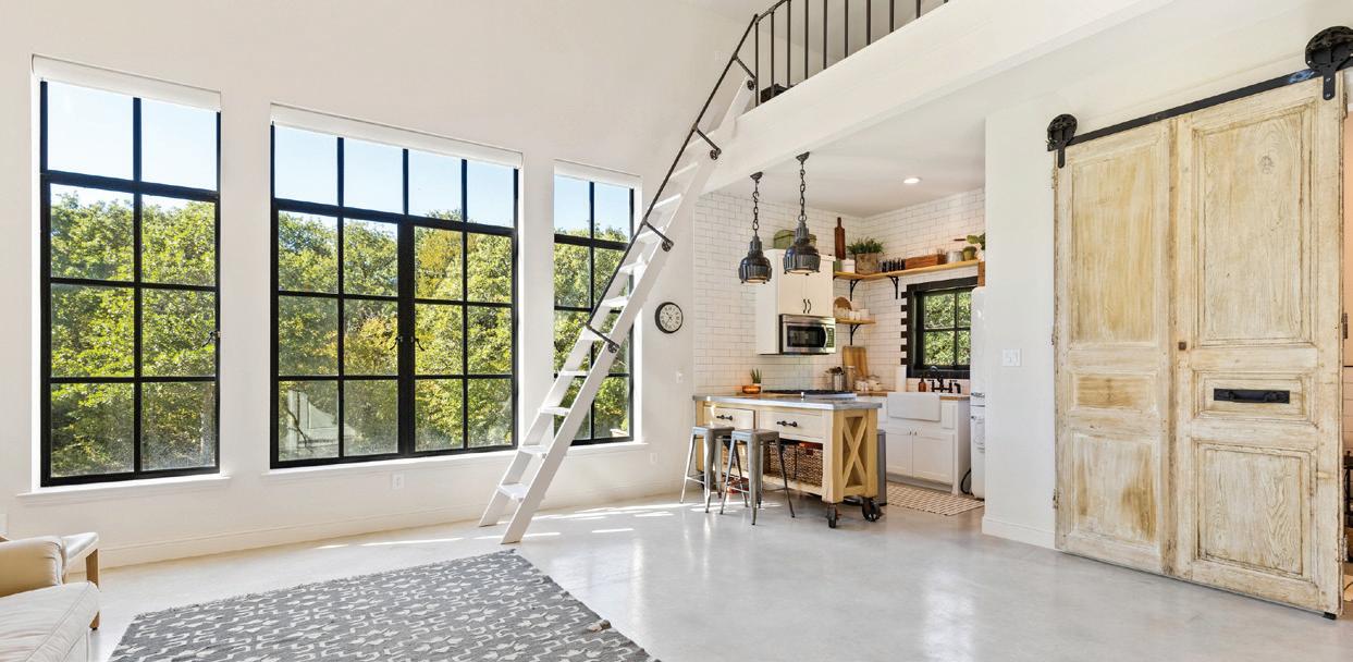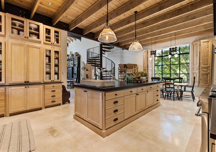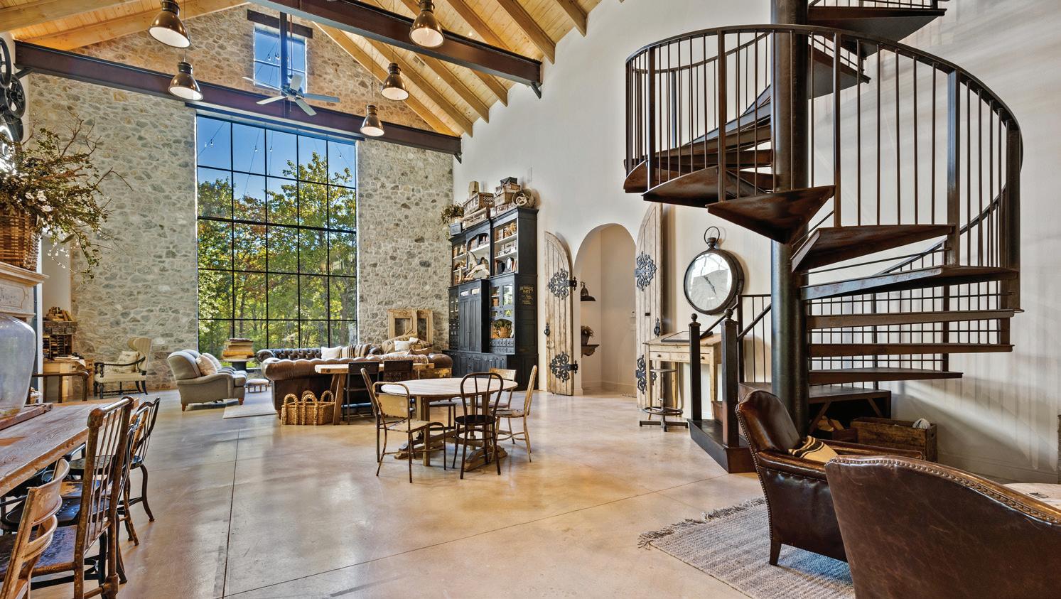 The main building is an open concept design with a nod to that abandoned factory feel. Exposed gray rock walls, exposed steel beams and a custom factory foundry wheel lighting system. Built on site by artisans across the country is an expansive spiral staircase, aged by the owner herself. Every detail thoughtfully and confidently designed to make you feel like you have stepped back to a time of long forgotten craftsmanship.