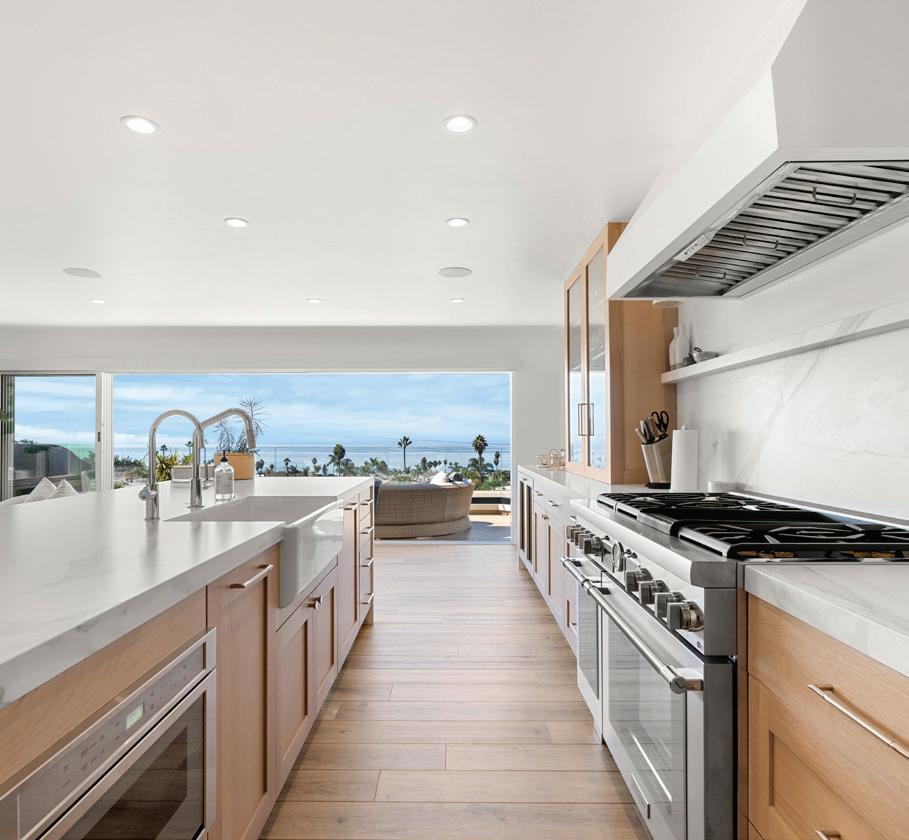 new construction in the most desirable Pacific Palisades Castellammare Mesa location! Stylish contemporary design by well regarded architect displays large bright rooms, 10’-11’ ceilings, the absolute perfect floor plan, and an abundance of windows to capture a spectacular view of ocean, hillside, city, Sunset Mesa and the Santa Monica Mountains while eliminating the feeling of surrounding properties. Golden Coast Development Group has spared no details in creating an oasis of privacy and beauty. Impressive front curb appeal with lush landscaping, exterior of limestone & plaster with wood accents, and an impressive front staircase to formal entry. Massive main floor chef’s kitchen with complete commercial Viking appliance package, side by side 3’ refrigerator/freezer, cook’s island, walk-in pantry, breakfast area and more--all with ocean views!!
