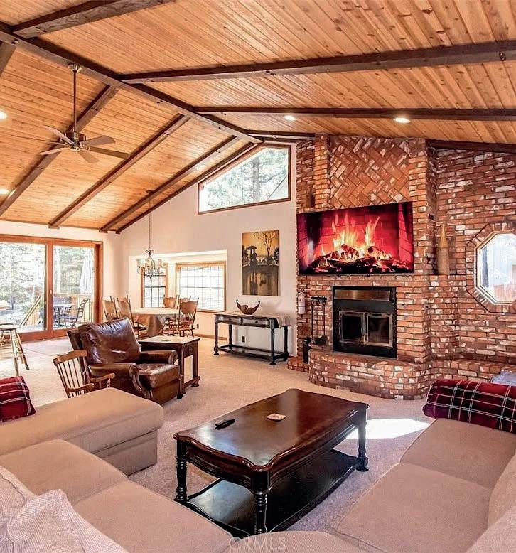 Beautiful Winter Park Estates home with underground utilities and paid solar panel system is situated on a large park-like lot conveniently located just minutes from The Village, Snow Summit and Big Bear Lake. This lovely upgraded wellmaintained home has a welcoming living room with floor-to-ceiling brick fireplace and accent wall, a vaulted Cedar ceiling, and many strategically placed windows to maximize the wonderful views and abundant natural light. The open concept dining area overlooks the ‘entertainer’s dream’ yard with several spacious multi-level decks and expansive paver patio featuring an outdoor kitchen, relaxing hot tub, numerous seating areas for enjoying the tranquil and serene surroundings in intimate settings or communal gatherings, walking trails and lush landscape. A well-appointed kitchen features very generous sized granite countertops, stainless steel appliances, an attractive wooden floor and large garden window with views of the delightful back yard and majestic pines. Step down into the warm and comfortable Cedar-lined den with wood stove, unique designer windows, and a convenient 3-piece bathroom. Upstairs is your spacious stunning Cedar-lined master suite with a cozy wood stove, luxurious ensuite bath and its own private balcony to take in breath-taking star-filled nights. Also upstairs are two large charming bedrooms with inviting bay window seats, and a lovely full bath for family and guests. This amazing home also offers a wonderful full-length covered front porch, recessed lighting throughout, big laundry room, newer furnace, tankless water heater, lots of storage inside and 2 storage sheds outside, heated over-sized 3-car garage (with roll up back door), RV parking, drip system and sprinklers, wood privacy fencing, and much more. Furnishings are even available for sale outside of Escrow. Don’t miss your opportunity to own this one-of-a-kind beautiful Big Bear retreat!!