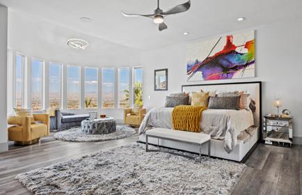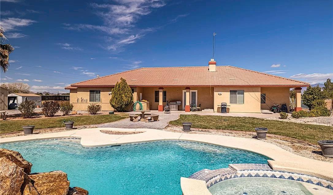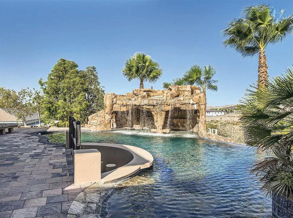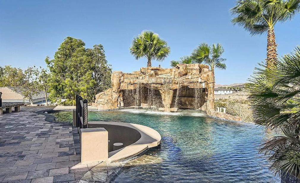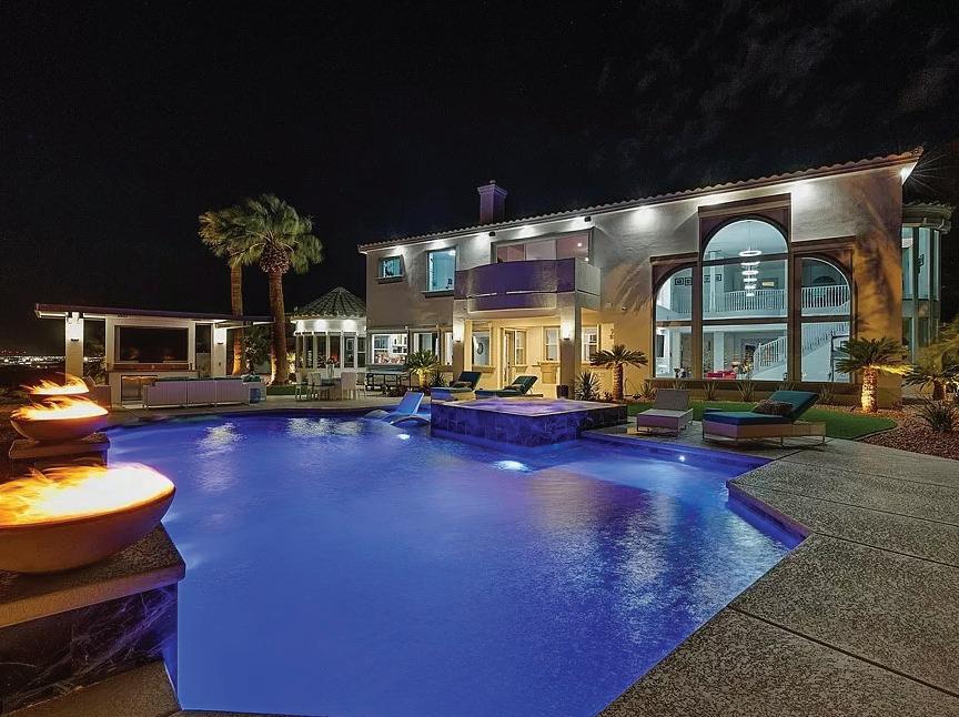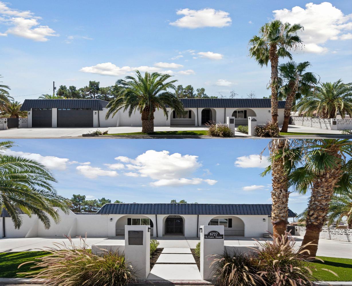 Located on a private road, this one-of-a-kind custom remodel 1 story rancher is nestled between Summerlin and The Lakes. It sits on a huge 1/2-acre corner lot and features 5 bedrooms, 4 custom bathrooms, and numerous amenities. The Great Room comes with vaulted ceilings, a fireplace, and wet bar. The large kitchen with island/sink and designer appliances is a chef’s dream. The primary bedroom features a 2nd fireplace, walk-in closets, and an amazing ensuite with a rain shower, designer stand-alone tub, sinks & faucets. The home has a 10-foot-deep pool with slide, diving board, jacuzzi, waterfall, LED lighting, and custom entertainment BBQ area. There’s even an incredible rooftop patio with a view of The Strip!