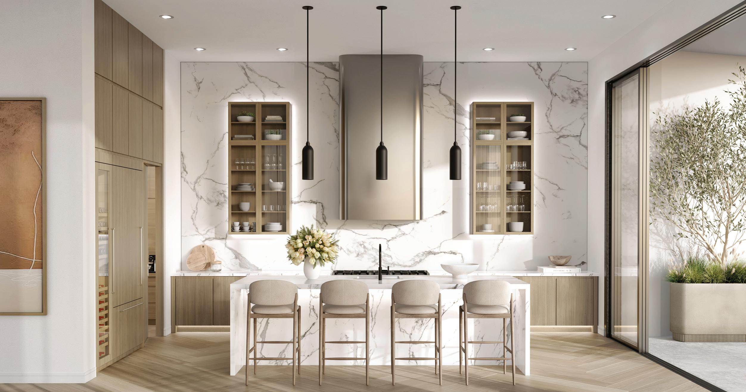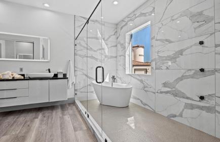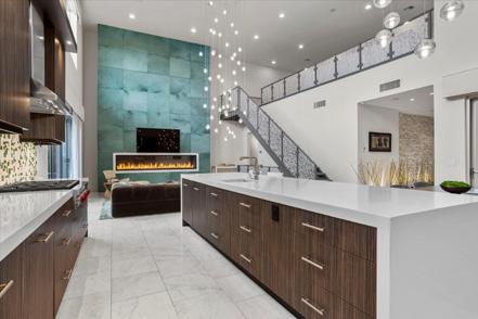 spa bath w/rain-steam shower, soaking tub & lavish floating vanities. Solid glass climate controlled wine cellar.