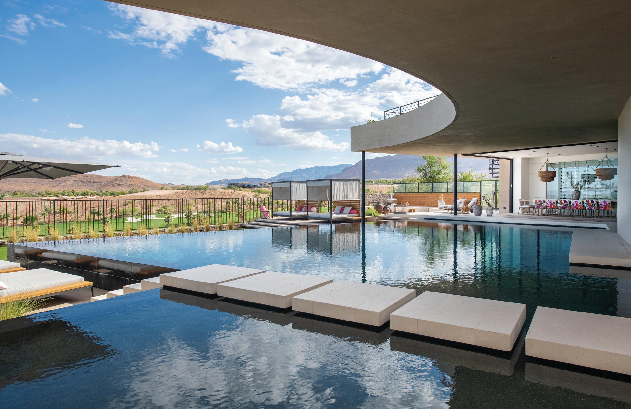 Fully immersed in modern minimalist luxury and completely connected to the natural environment, this exquisite custom home is an architectural marvel. Located in the Summit Club, the home is nestled on a 1+acre premium corner lot overlooking mountains, golf course and strip views. The expansive pocket sliders create an indoor outdoor living experience. The home boasts a gourmet chef’s kitchen, top-of-the-line appliances, temp controlled wine wall, a flex room, gym and 2 large secondary bedrooms with ensuite baths. The primary bedroom features a private sitting area with direct access to it’s own spa. Primary bathroom features an outdoor oasis with dual showers. Adjacent to primary closets, is your own private office. A resort-style backyard features 2 zero edge pools with spa, & an outdoor kitchen equipped with a pizza oven & bar. The roof deck with bar offers jaw dropping views of the strip & city lights. A private attached 5 bedroom 4 bath casita offers endless options for your lifestyle.