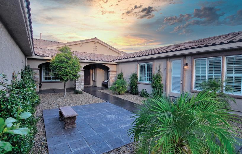 2 beds | 3 baths | 2,659 sq ft | $842,500. SIMPLY STUNNING! This extraordinary home is a rare find in Sun City’s only gated community. Located on a quiet Cul de Sac and surrounded by the picturesque Flat Top Mesa, this .36 acre Desert Oasis offers sophistication, comfort and seclusion. The landscaping is incredible! This exquisite home embraces over $250,000 in luxurious upgrades including over $48,000 of Solar Technology thus making this home fully energy independent and eco friendly. Natural light is plentiful as large picture windows & multiple sliding doors bring in the remarkable outdoors. Appreciated is the spacious open floor plan hosting crown molding, stacked stone walls, tile flooring, surround sound and custom window treatments. A granite covered island anchors the kitchen and a spacious eating bar separates the nook. The owner’s suite hosts a bay window that opens the space to the moonlit mesa. The ensuite feels like a spa with a modern tub, stacked stone wall & fireplace, gorgeous walk-in shower and spacious closet. A pocket door makes the guest room a true suite opening up to a beautiful remodeled bathroom. Oversized & insulated, the garage has its own AC unit, epoxy coated floor and built in shelves.