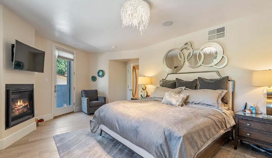 The six-car subterranean garage includes two EV charging ports, while the 1,700-square-foot backyard patio boasts a fireplace, barbecue, jacuzzi, and inground swimming pool.