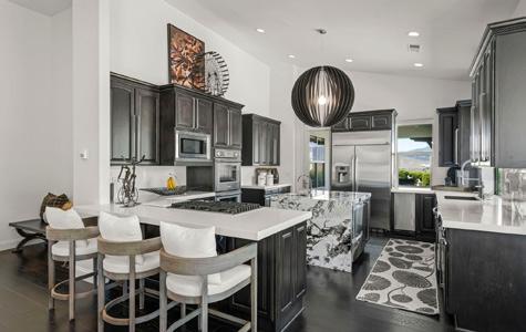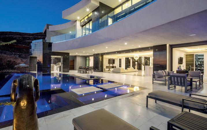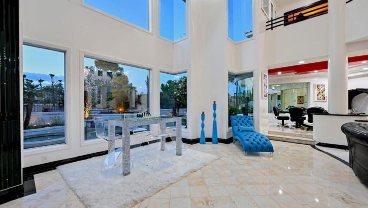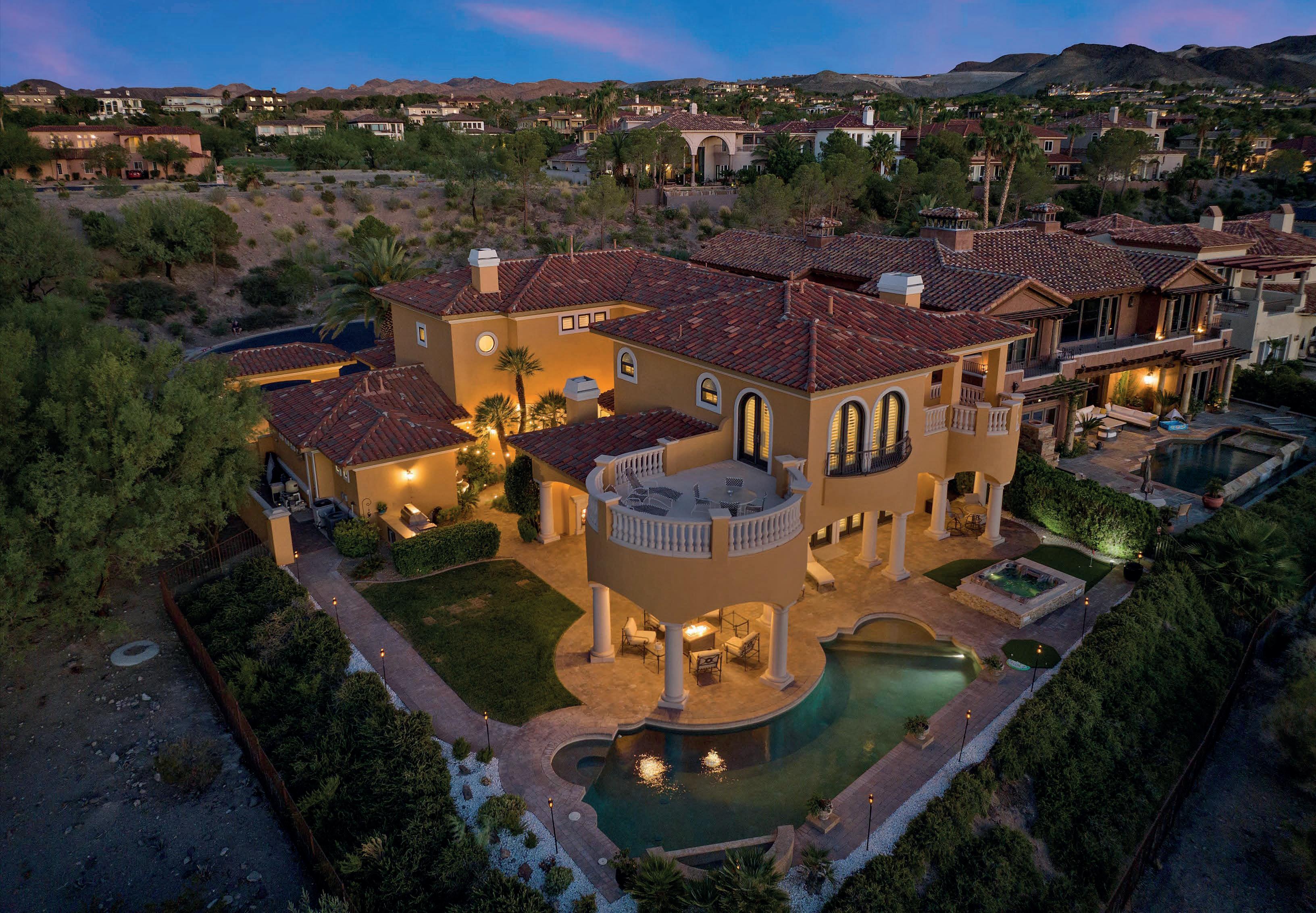 5 BD | 5 +2 BA | $3,799,000 | 7,795 SQ FT | ON ALMOST 1 ACRE | This 7,900 sq ft home offers 5 bedrooms, 5 ensuite bathrooms, and 2 half bathrooms, as well as a flex room that is perfect for a home fitness room, theater room or a child’s playroom. One of the bedrooms can be used as a home office. There are 2 primary bedrooms one on the 2nd level, as well as on the main. The downstairs open floor plan has a gorgeous formal dining area, a game room, kitchen, and living room and VIEWS of the Vegas Strip from every room!! The kitchen boasts a massive book-marked island, high end Viking Stainless steel appliances including 48-inch refrigerator, 48-inch oven with 8 gas burners, two dishwashers, dual sinks, European cabinets, walk in pantry and the 48-inch gorgeous blue vent hood to give it much character. This home is on almost an acre of land, so why spend your time inside when can enjoy resort-style living in your backyard oasis.