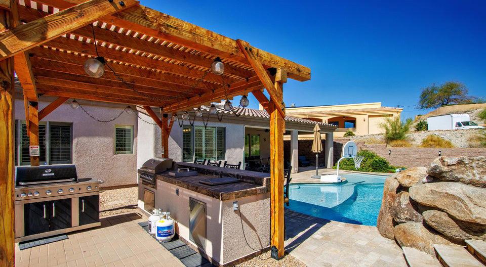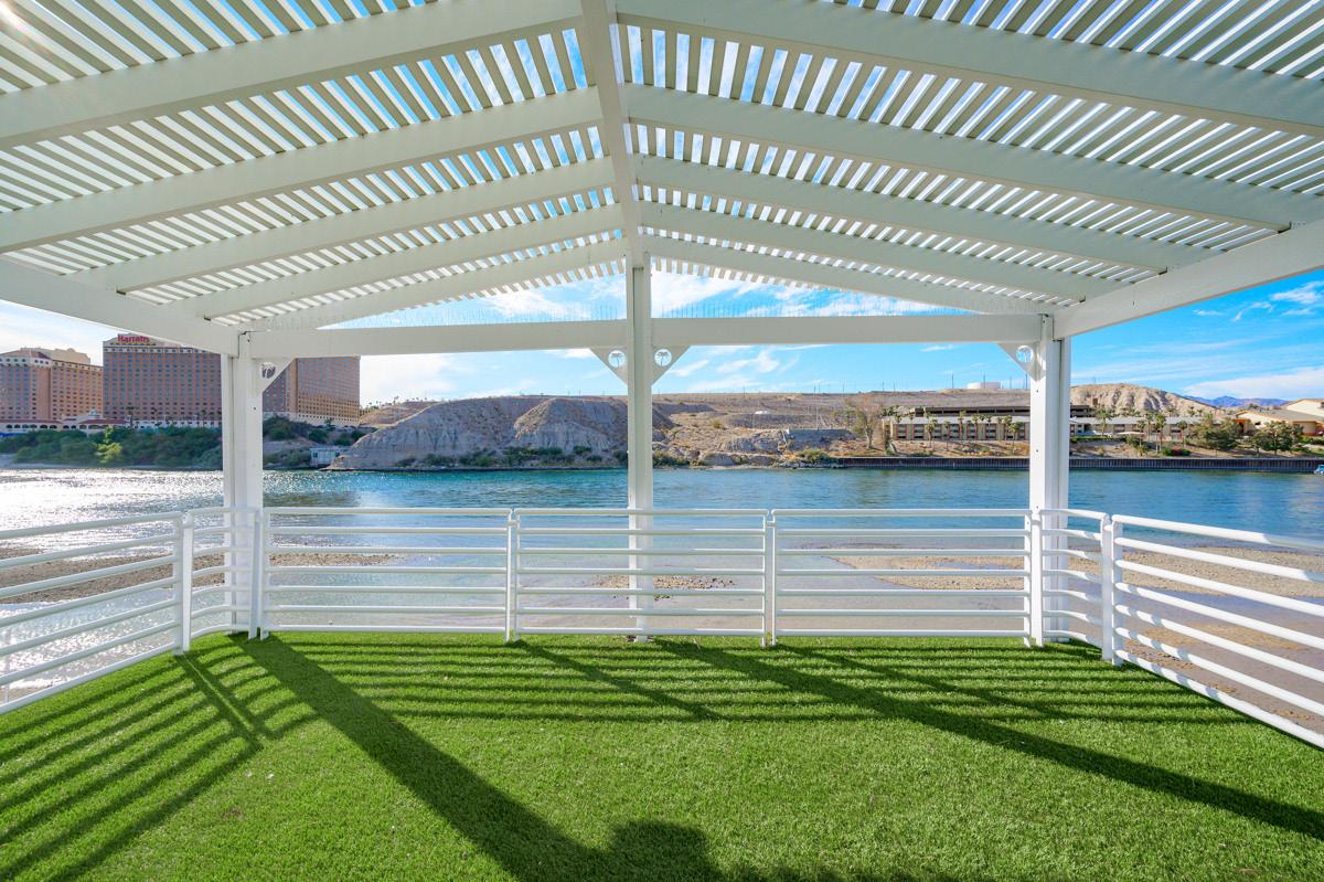 Your River Oasis Awaits with resort living on the Colorado River! This riverfront oasis welcomes you with a private electric gate and dazzling views of casino night lights reflecting off the cool, crisp Colorado River. A gorgeous entry door with stained glass detail and keyless entry leads into a home where panoramic river views and elegant square tile flooring create a serene ambiance. Step inside to discover an impressive use of space paired with tasteful decor and sophisticated upgrades. The main house features 4 spacious bedrooms and 2 well-appointed bathrooms, highlighted by a beautifully upgraded kitchen with granite countertops, stainless steel appliances, and a large stainless kitchen sink. The dining room offers both style and functionality, featuring a pub-style bar with window seating and space for a small dining set.