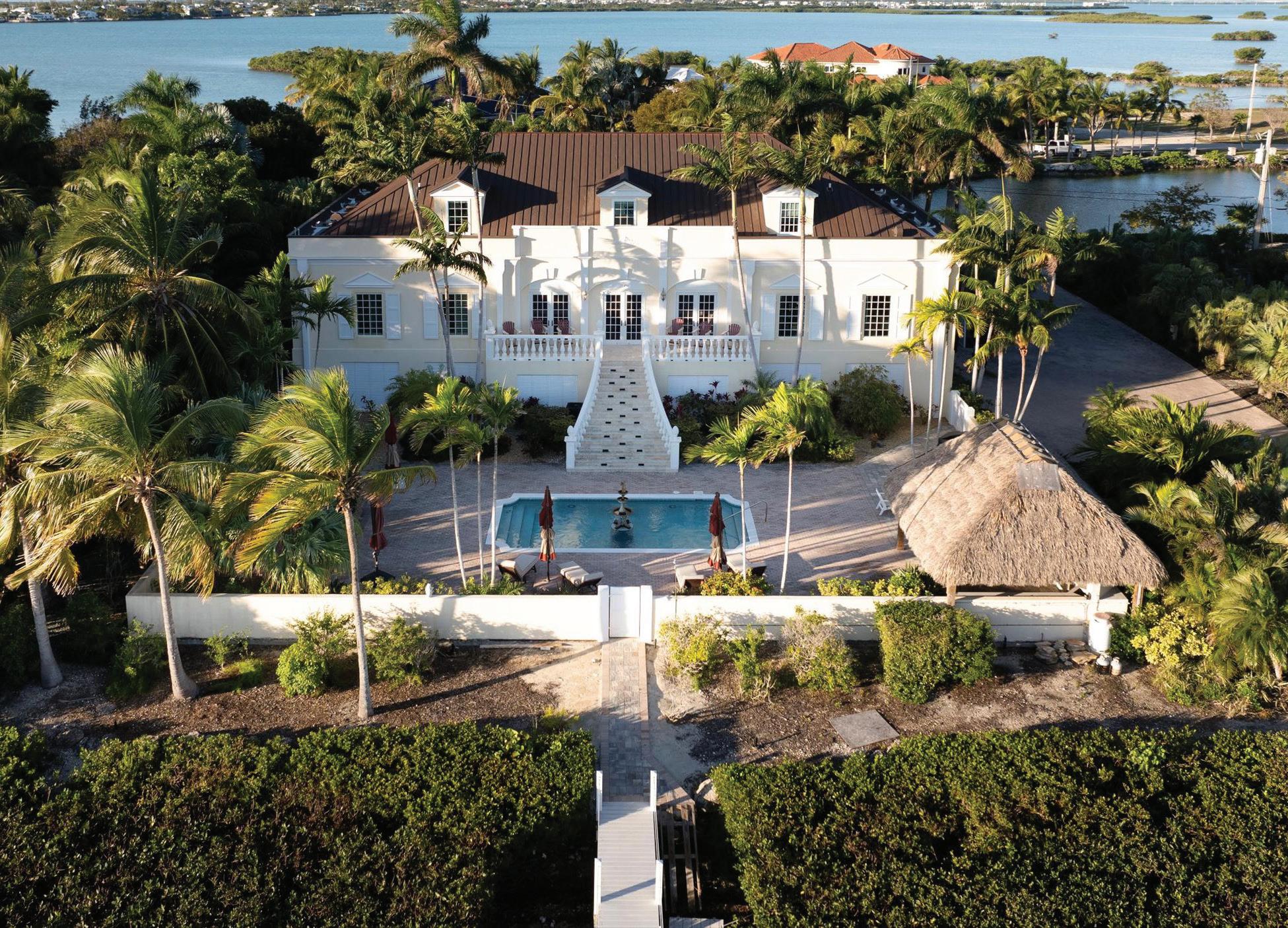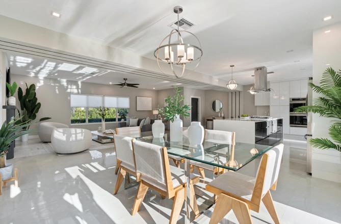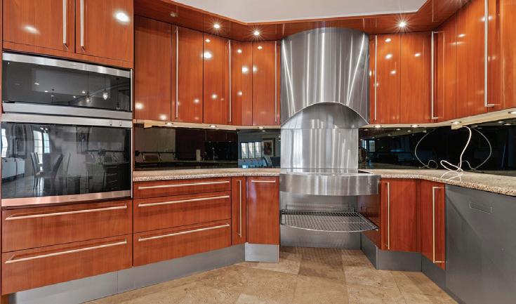 The main floor boasts a stunning living and dining area with 20 ft. ceilings, offering expansive bay water views. The state-ofthe-art kitchen is a chef’s dream, featuring a unique Benihana cooking station, top-of-the-line appliances, and ample storage space. Enjoy the convenience of a large, easily accessible laundry room and two guest bedrooms with en-suite bathrooms.