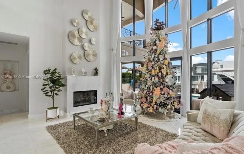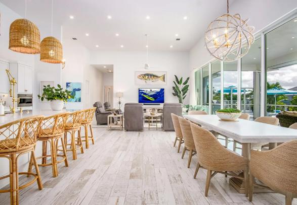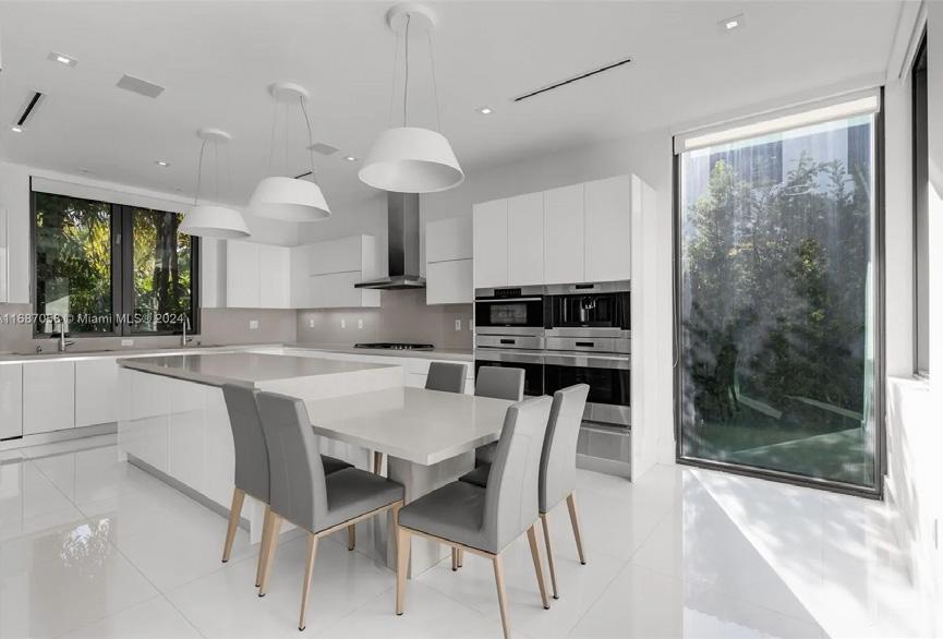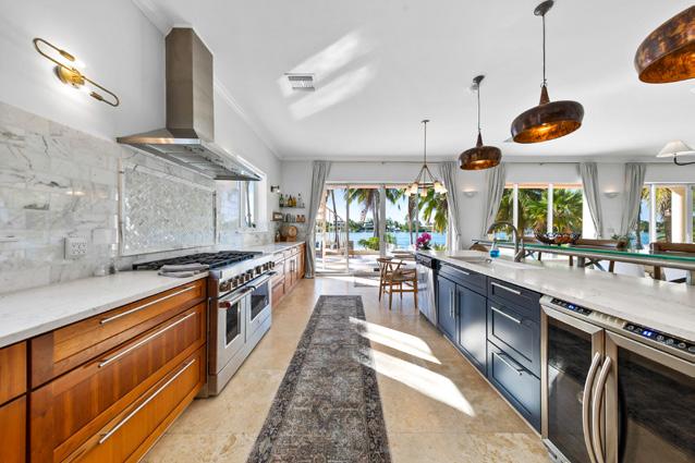The main floor boasts a stunning living and dining area with 20 ft ceilings, offering expansive bay water views. The state-ofthe-art kitchen is a chef’s dream, featuring a unique Benihana cooking station, top-of-the-line appliances, and ample storage space. Enjoy the convenience of a large, easily accessible laundry room and two guest bedrooms with en-suite bathrooms.