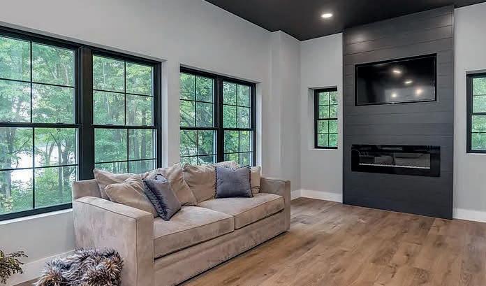 Private Oasis that sits on 2 acres and offers 253 ft of shoreline on Lake George. This custom, modern 6,400 sq ft home has everything you need and then some! The design showcases large living areas as well as 5 bedrooms and 8 bathrooms. On the main floor you will be welcomed by a wonderful open foyer with tall ceilings. A convenient powder room is nearby. A wide hallway will take you into the great room/kitchen where you will be breathless from the wall to wall and floor to ceiling windows looking out to the waterfront beyond. This gourmet kitchen features a full sized Sub-Zero refrigerator and another full sized Sub-Zero freezer as well as a 48 inch gas range with double ovens and 2 dishwashers. Concrete countertops and hammered metal lighting pendants add texture to this space. Off the great room there is a cozy hearth room that has a gas fireplace, built-in bar with wine chiller, and lot of windows featuring the foliage of the trees just outside. There are 4 bedrooms on the main floor.