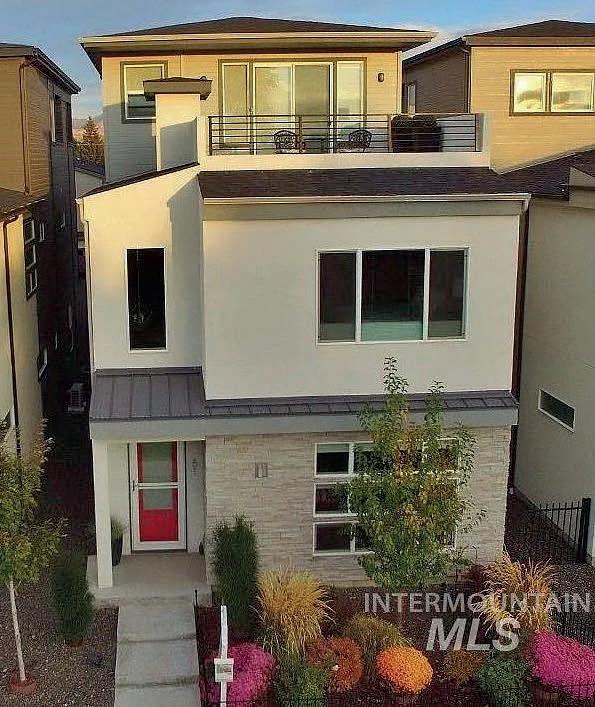 Unique opportunity in downtown Eagle. Construction by Keystone Development, known for modern high end architectural design. Real hardwood flooring. Hunter Douglas custom window treatments. Gourmet kitchen with waterfall quartz island, gas range & custom cabinetry. Open & airy living/dining areas. Tri-level with 4 bedrooms. Bedroom with ensuite on first floor. Primary & secondary bedrooms, laundry & bonus on second level. Primary retreat includes large windows, sitting areas, spacious walk in closet. Incredible ensuite with quartz counters, dual vanity, designer tile, enormous shower & free standing soaker tub. Extended 2 car alley load garage, drip/sprinklers. Newer designer finishes throughout the home. Enjoy majestic sunsets and sweeping views from all around your huge third story 4th bedroom or office with sliders to the terrace outdoor gas fireplace. Turn-key, lock & go patio home ideally located near Greenbelt, downtown Eagle, Guerber Park and Eagle attractions.