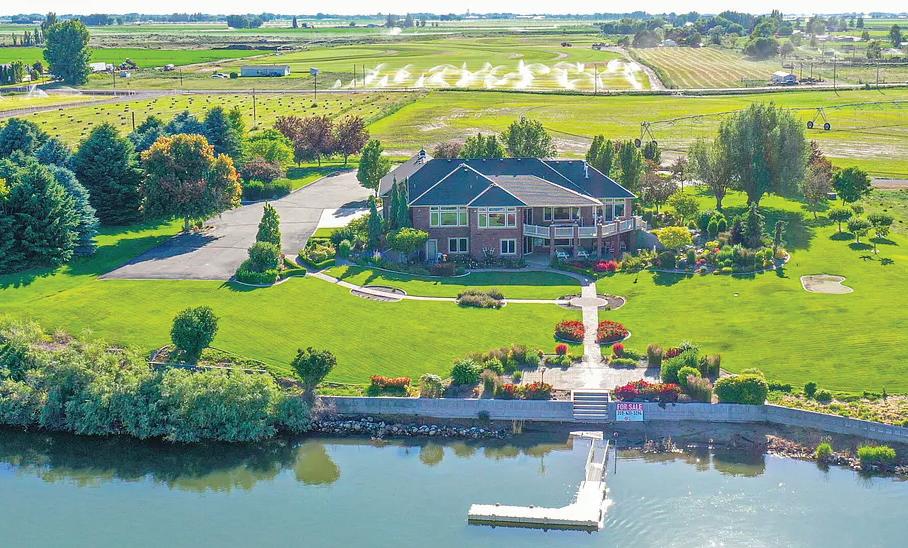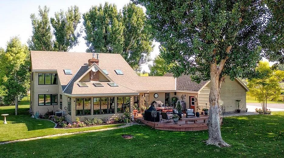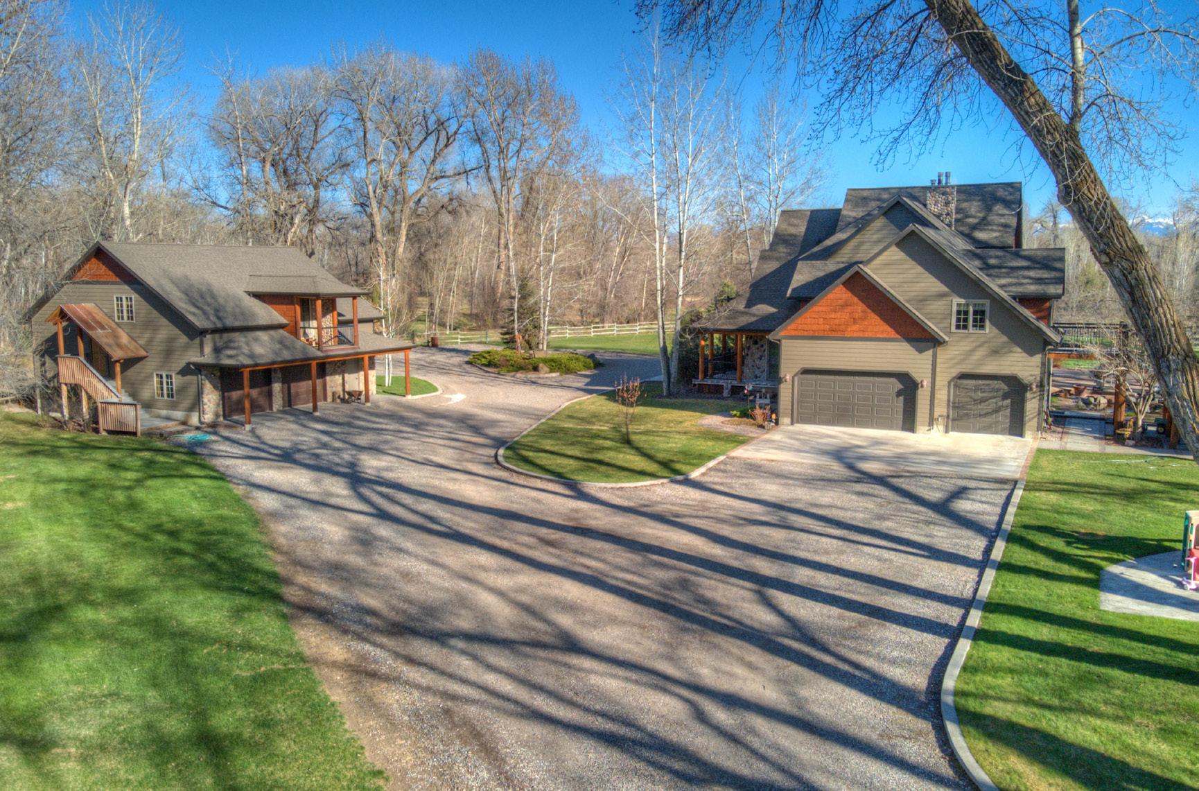 This magnificent residence in Montana emanates tranquility and sophistication, nestled by the serene Gallatin River. Upon entering, you are greeted by a stunning foyer with a majestic hand-hewn log staircase. The home offers a variety of amenities, including a spacious music/office room with charming French doors. The kitchen is a culinary delight with a double oven, island featuring a 4-burner gas cooktop, Corian countertops, dishwasher, built-in cabinet-style refrigerator, and elegant glass-front cabinetry. A formal dining room and a living room with soaring 28-foot ceilings, a river rock fireplace, and log mantle provide luxurious spaces to relax. The primary suite boasts a large walk-in closet, dual vanities, a soaker tub, and a separate tiled shower. The laundry room is conveniently located near the kitchen and leads to the 3-car garage. Upstairs, there are four bedrooms, two bathrooms, a spacious TV room with a fireplace, and an office/craft/exercise space opening to a stone deck. The property features a basketball court, volleyball net, firepit, and a back patio with stamped concrete, landscaped yard, pond, and gazebo area. The Moreland Ditch runs alongside a charming boardwalk on the property, and there is a detached garage with a 1-bedroom ADU/apartment. Encompassing 23 acres, including a stretch across the river bank, this grand 5,090 sq ft estate epitomizes the essence of Montana living & is truly a sight to behold.