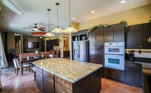 The patio area is perfect for entertaining friends and family, with a wonderful pool w/ a rock water slide feature , spa/hot tub, fire pit, and an outdoor kitchen. The large-screen TV is perfect for enjoying the big game or movies while soaking in the hot tub. Other notable features of this stunning property include large storage room under each of the 3car and 2 car garages. Each garage also has built-in cabinetry, and a pet wash.
