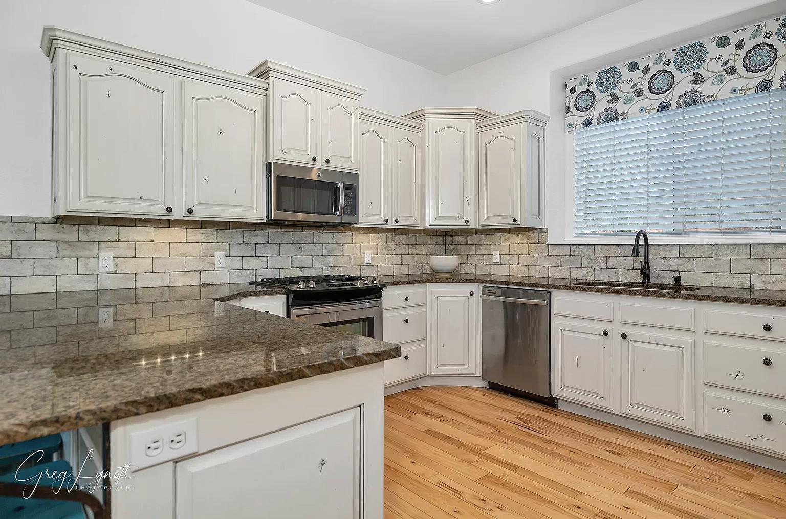 home is stunning inside and out! Beautiful cathedral ceilings bring ample natural light into the main level living area. Thoughtfully designed built ins, crown molding and welcoming colors. Lovely kitchen has granite island and beautiful cabinets with glass detail. Gorgeous hardwood floors in kitchen and dining area leading out to oversize patio, raised beds and convenient shed great for storage or work space. Main level master with walk in closet, ensuite spa garden tub, double vanities, and large shower. Large bedrooms and lots of storage throughout. No front and back neighbors and walking distance to shops and restaurants. Welcome home!