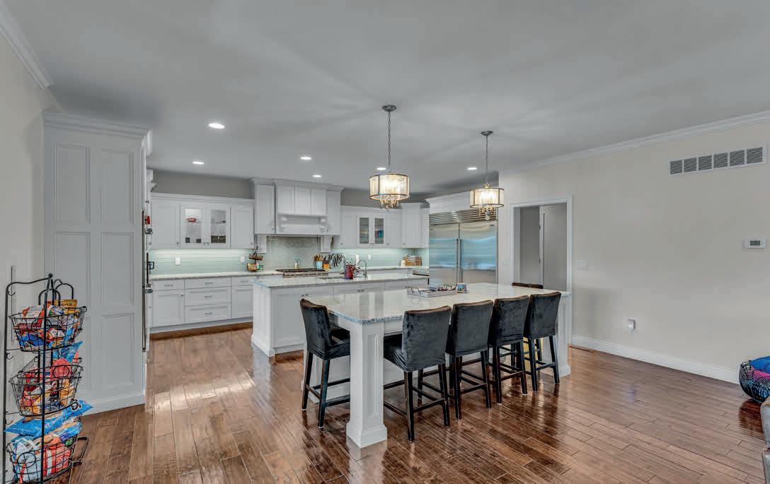 • Kitchen with Granite Island, Apothecary Cabinet, Two Sinks, Gas Stove, Desk Area