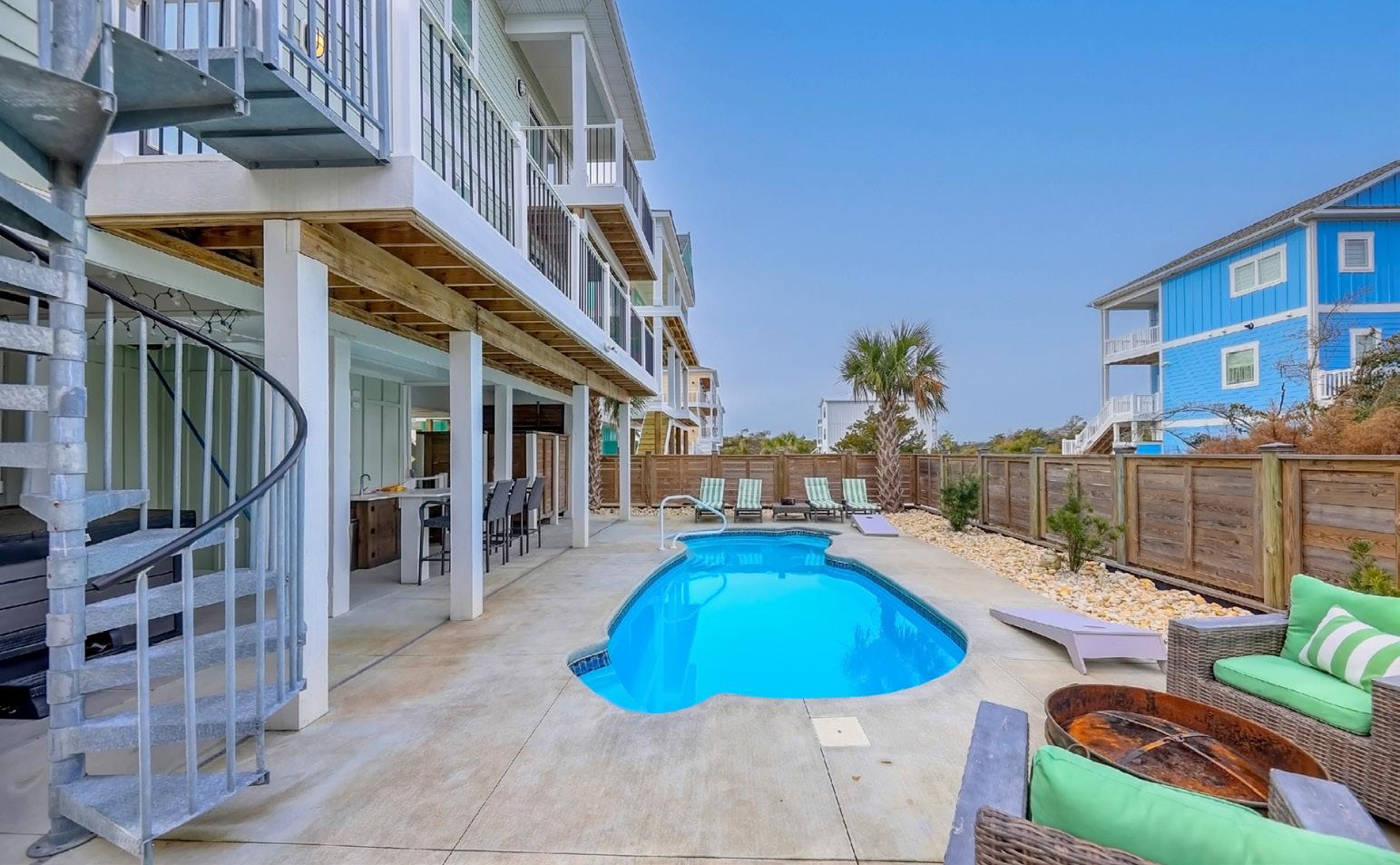 A picture-perfect Oceanfront home offers the intimacy of a cottage, yet is set within a sprawling amount of space. It’s distinctive from the moment it greets you with its shingled roof and white picket fence front yard. Meticulous detailing and care has been given by the owner. Welcome to the main level into a beautiful & window-lined living area with hardwood flooring leading into the thoughtfully designed kitchen with ocean views & a very generous amount of counter space for multiple cooks. Here a splendid dining room was built to accommodate a full house. The main en-suite bedroom is located on this level as well. Off the kitchen is the all-weather room, which leads to sun deck, beach and pool. Top level consists of 3 large bedrooms and 2 full baths. Ground level has an en-suite bedroom, and a den. Outside you will find a covered & shuttered (a nod to the old Nags Head Casino) get-a-way lounge area, and hot tub space for welcomed break from the sun or continued enjoyment rain or shine. The pool area is large with ample sun bathing space. A very private location & beach, away from public walkways. Truly a must-see home!