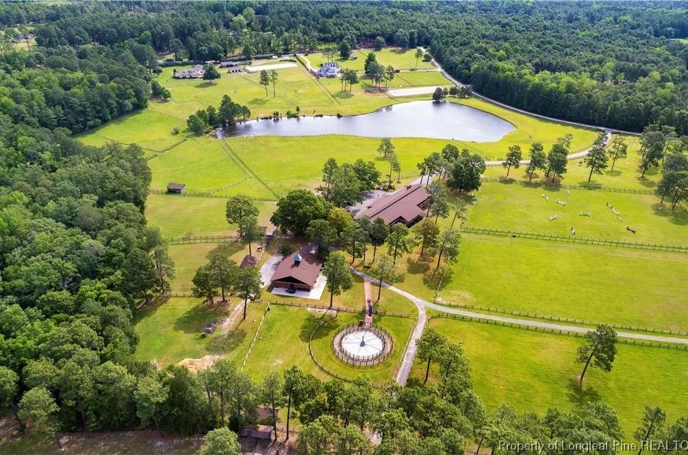 Elegant Equestrian Estate in the heart of Southern Pines Horse Country! The home features soaring ceilings, multiple living & dining spaces, a library, space for wine cellar in basement, and an amazing screened in porch with an outdoor kitchen! The primary suite is on the main level and offers an expansive bath, closet area, and a home office. Upstairs you’ll find 3 large bedrooms with ensuite baths and ample storage. The home is privately located at the back of the property, down a tree lined drive and surrounded by beautifully manicured lawns and fenced pastures. The 6 stall, center aisle barn offers spacious stalls, a tack room, a feed room, interior wash stall, ‘guest quarters’ with bath, and large storage bays perfect for equipment or carriages! There are 4 separate paddocks and two outside Run In sheds. The 10 bay detached garage has workshop space. Detached storage for RV or horse trailers and equipment is also available.