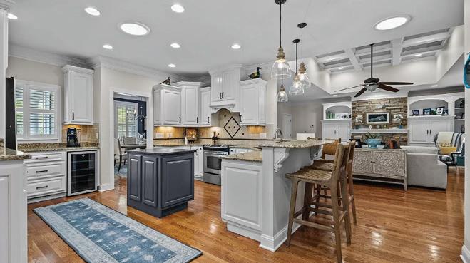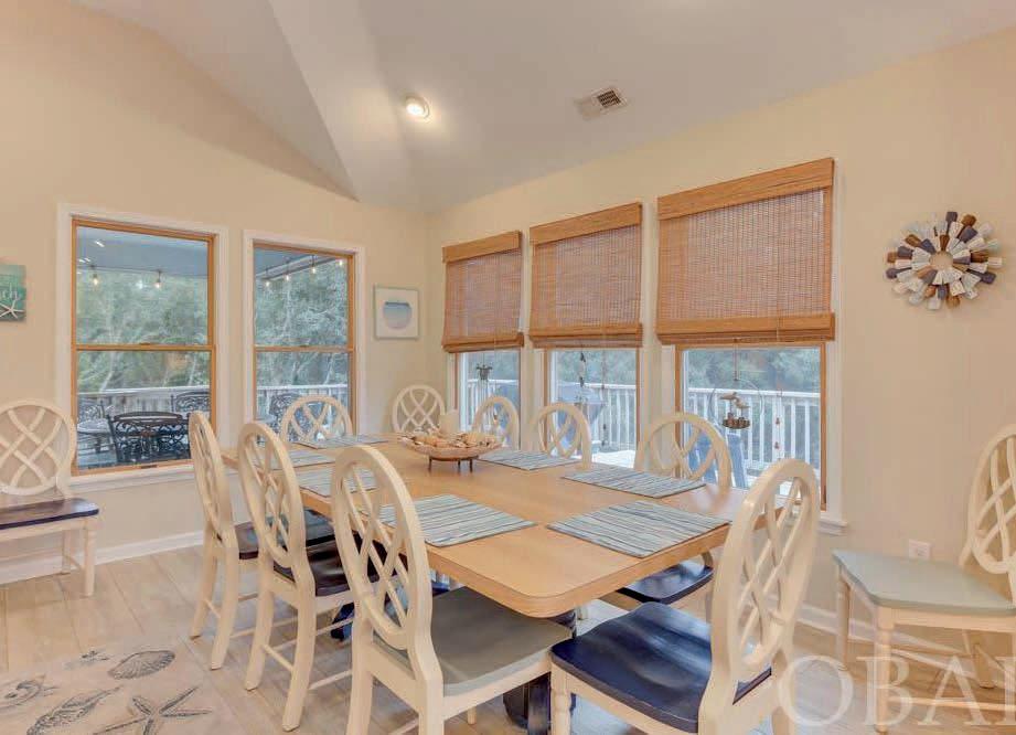 landscaped yard with bricked walkways, picnic patio, curved steps and retaining wall at waterside, a great place to relax and enjoy the expansive Bogue Sound water views! Inside you will find a large kitchen opening into the dining/great room area.