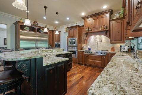 Epitomizing relaxed elegance, this property is situated within an exclusive gated community. Mature landscaping expands across 1.5 ac, delivering the perfect backdrop to a sensational three-level home. 7 bedrooms,6 full and 2 half bathrooms. A highlight of the expansive accommodation is the primary wing on the main level, which benefits from its own private office and entrance. Elsewhere, drama is added by the two-story great room, with its flowing indoor–outdoor design, while the heart of this floor is the gourmet kitchen, fully equipped with Thermador and Sub-Zero appliances. The lower level also delights, with a wet bar and media center, as well as an exercise room, craft room and a sunroom opens out to the sublime patio, taking advantage of the fabulous garden views. Attention has also been given to high efficiency, greenbuild innovations that work in tandem with wide-plank Brazilian ipe floors and custom moldings, with a wholehouse Sonos system providing the ideal soundtrack.
