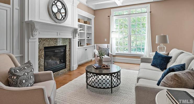 w/ its cozy fireplace & a spectacular custom builtin wall unit, a