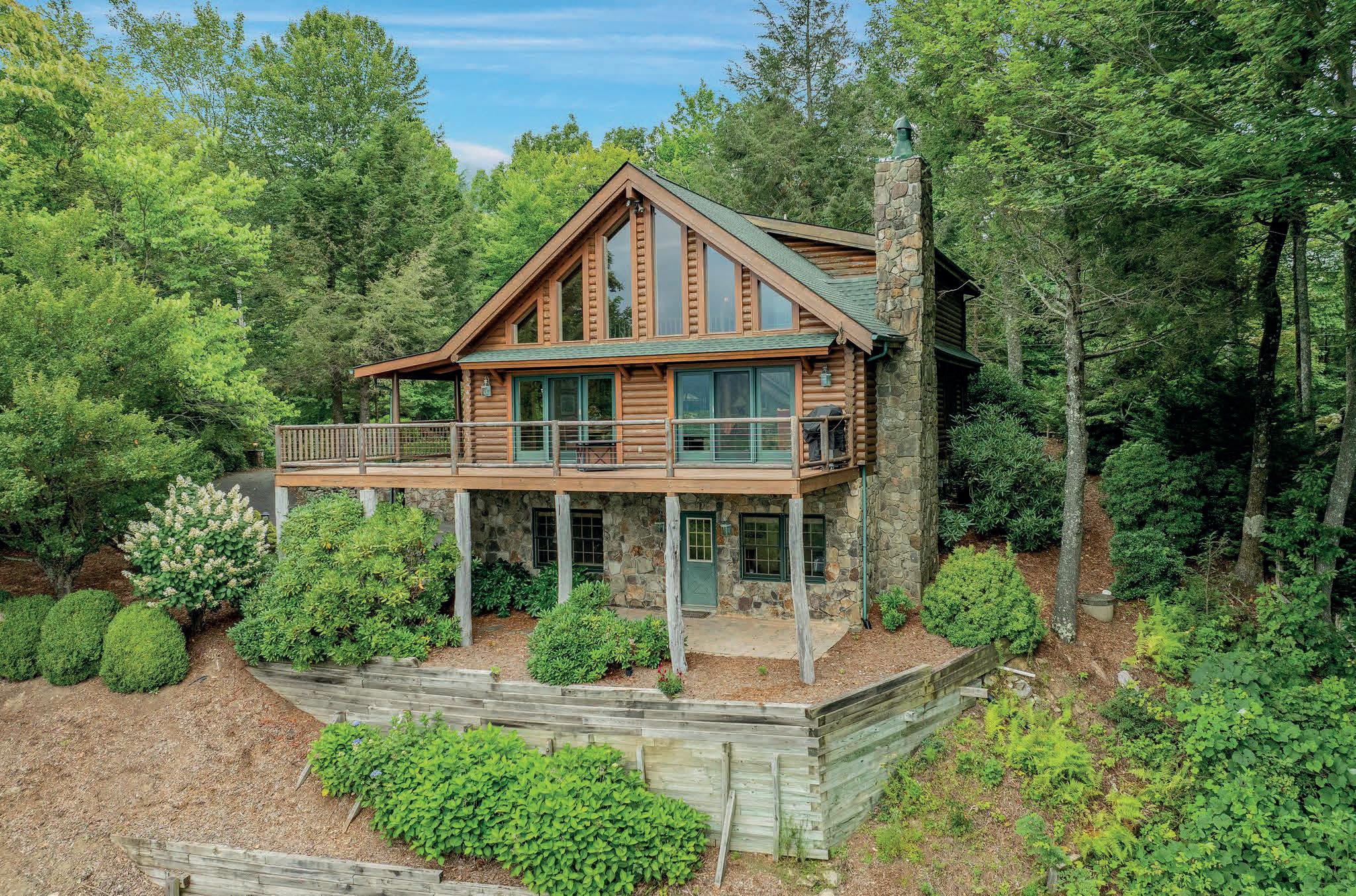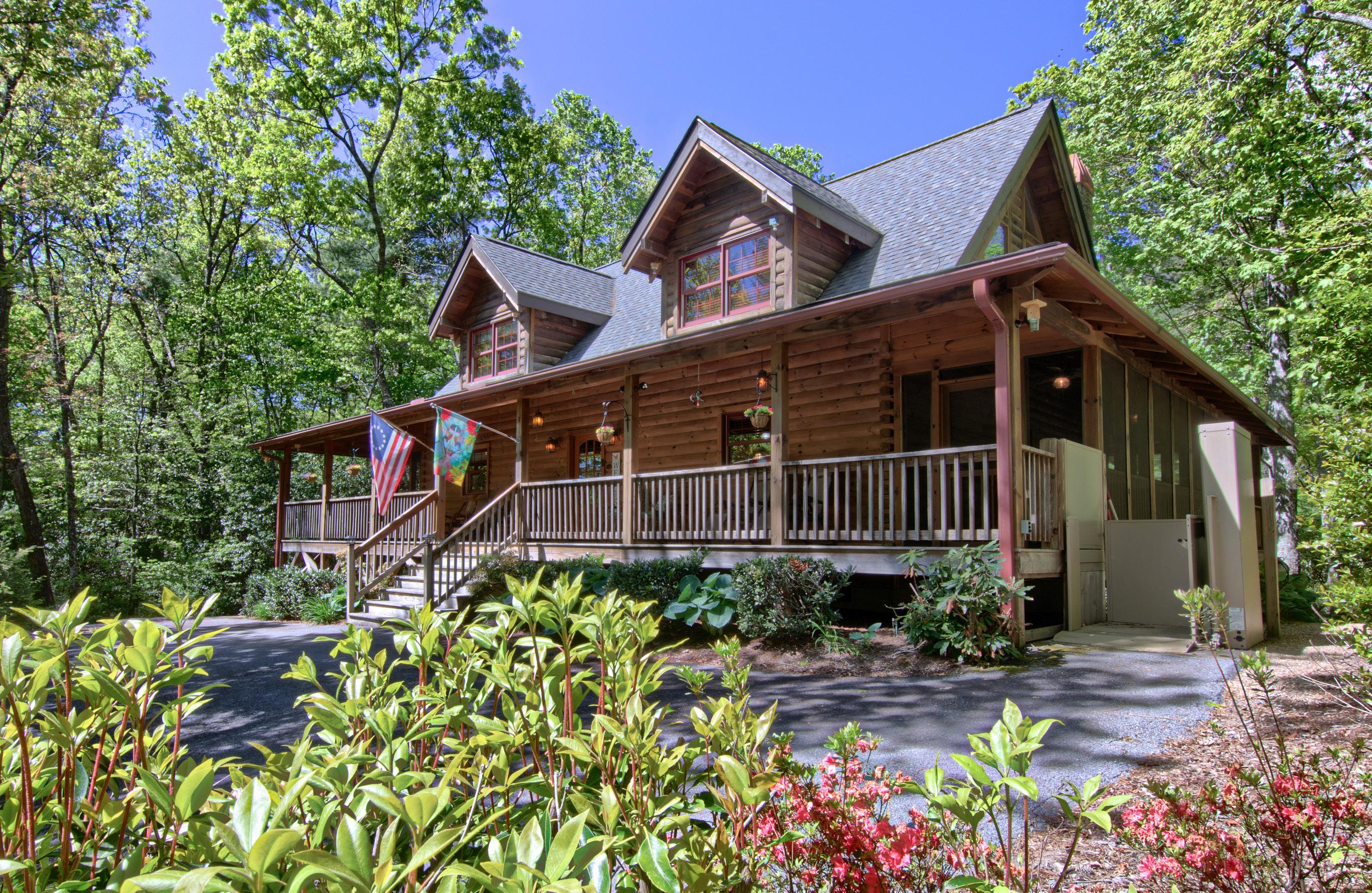 Exquisite log home offers a tranquil sanctuary as it borders the stream & cascading waterfall in this private gated mountain community. Enjoy modern comforts with rustic charm, from this fully furnished home that features elegant fixtures & premium finishes. The 2- story great room has a stone fireplace & views of the outdoor wonder. The kitchen features granite countertops, knotty Alder cabinets & newer appliances. The primary suite is designed to be a oasis with French doors to the covered porches, an ensuite with double vanity, a tiled walk-in shower & walk-in closets. Upstairs is the loft, two bedrooms & a full bathroom. The wrap-around porches provide a seamless transition from indoor to outdoor living. Additional Features: Generator & Wheelchair lift. Amenities: lodge with pool, hot tub, sauna, fitness facility, 6 miles of hiking trails, waterfall, pond, creeks & more. Just 15 mins to stores & medical facilities. 20 Mins to Hendersonville. 30 mins to Asheville.