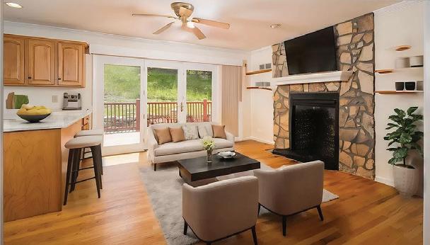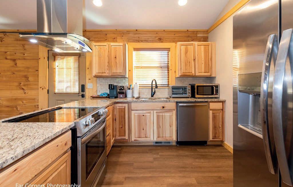 $349,000 | A charming cottage tucked away in the woods with plenty of light. Easy access and privacy. This home offers an open floor plan with an amazing stone fireplace in the living room and an incredible view as you step out side onto a large partially covered deck.