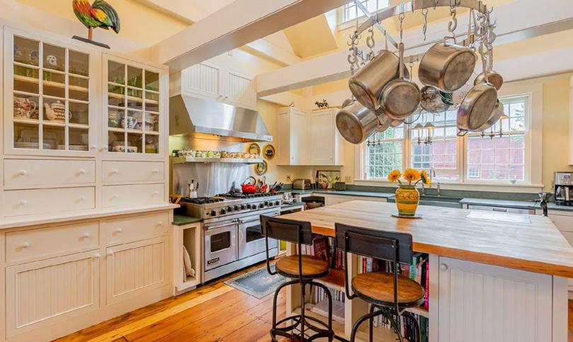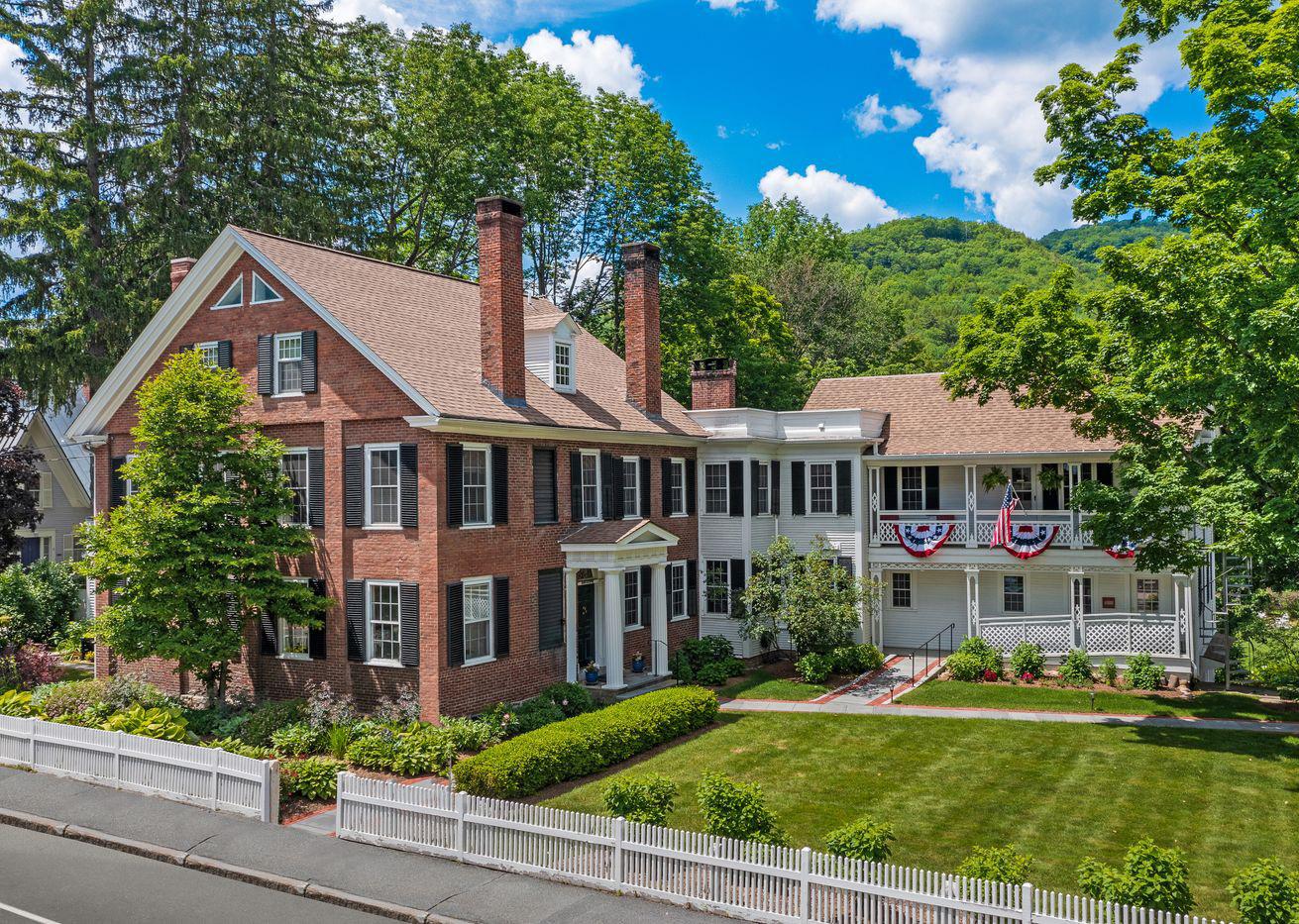 A handsome Federal Greek Revival built in 1831 by Joel Eaton, Three Church Street is at the heart of the picturesque village of Woodstock, voted the most beautiful town in America by Conde Nast Traveler. The house is rumored to have been a stop on the Underground Railroad and local lore has it that General Lafayette slept here. The east wing was added in the 1860s and was a recovery home for civil war veterans. Set on just under two acres with 249 feet on the Ottauquechee River, the exquisitely renovated house has maintained its historical integrity while adding modern amenities such as en-suite bedrooms and air conditioning. The two-acre property has been meticulously maintained and is in exceptional, move-in condition. It comes completely furnished and includes an in-law apartment and guest apartment.
