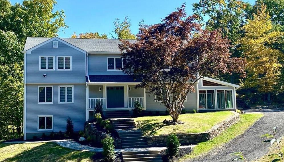 An expansive porch looks out over a private back lawn that gently slopes down to the river with views of Mt. Tom. The outdoor areas have a sense of space with the added pleasures of perennial gardens, a heated pool and fire pit.