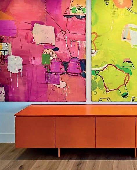 A recently completed project for a client in Miami Beach. Warner York designed this Hermès orange, custom credenza shown with 3 modern abstract paintings, hand selected by Warner York from artist and friend, Gary Komarin whom they work with closely.