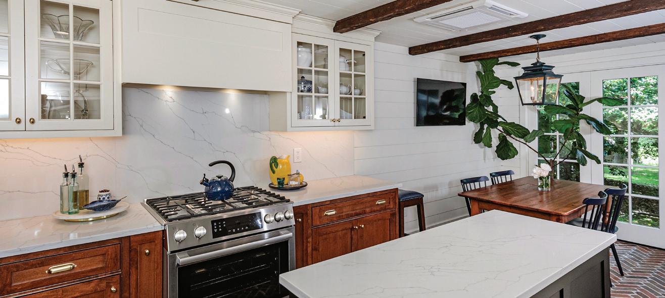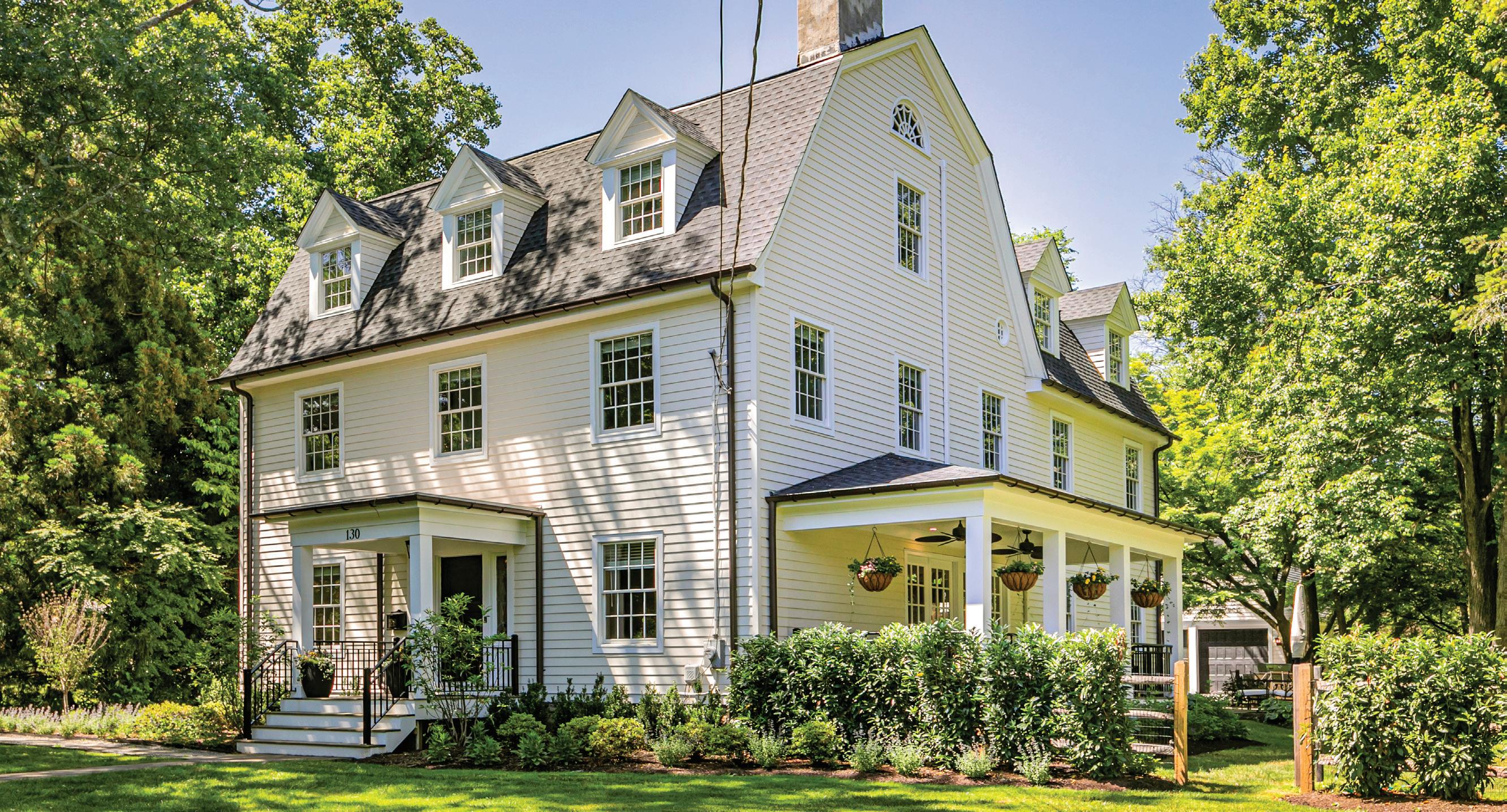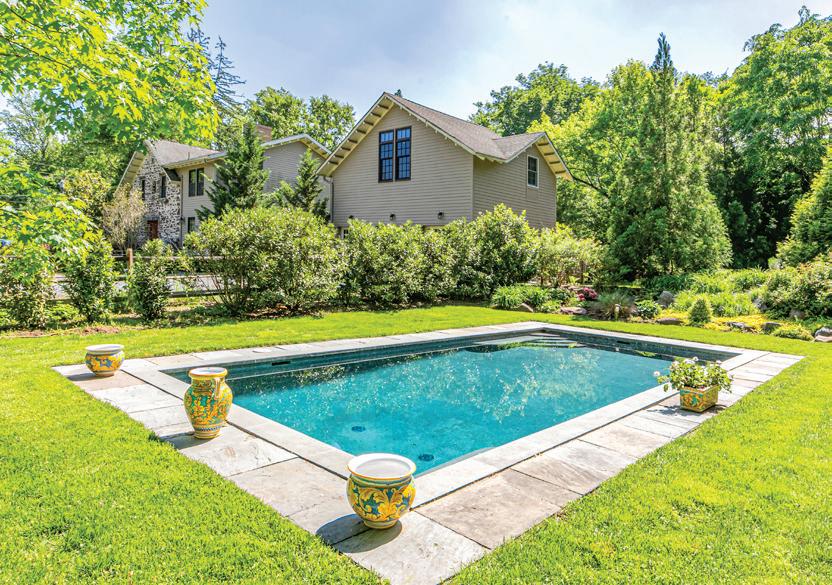 With a prominent spot along the most admired stretch of Library Place, Princeton’s Western Section neighbors have watched with anticipation as this gracious 1848 Colonial was restored over the course of two years. Everyone can appreciate the new DURATION poly-ash siding, roof, windows, and mahogany porches, but few have seen the interior improvements, which include new oak floors, glamorous baths and gorgeous quartz in the refreshed kitchen. French doors and transomtopped windows let in views of the partially shaded yard and bluestone-edged pool.