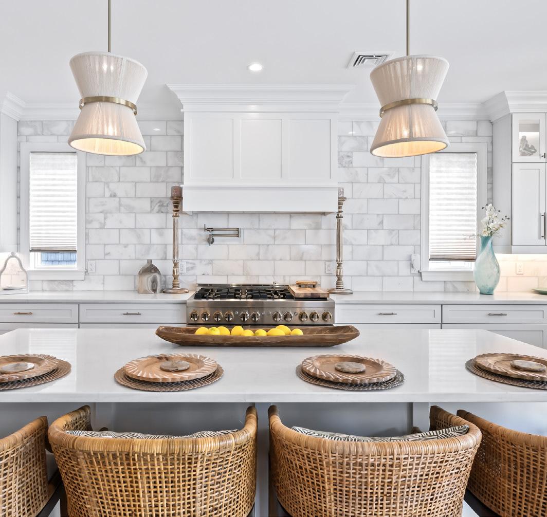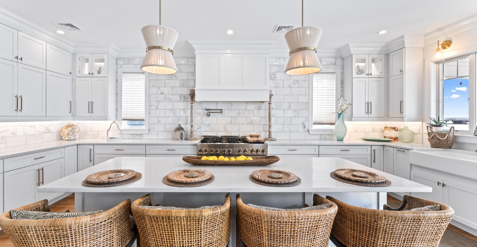 • Custom Italian kitchen cabinets with quartz countertops and waterfall island