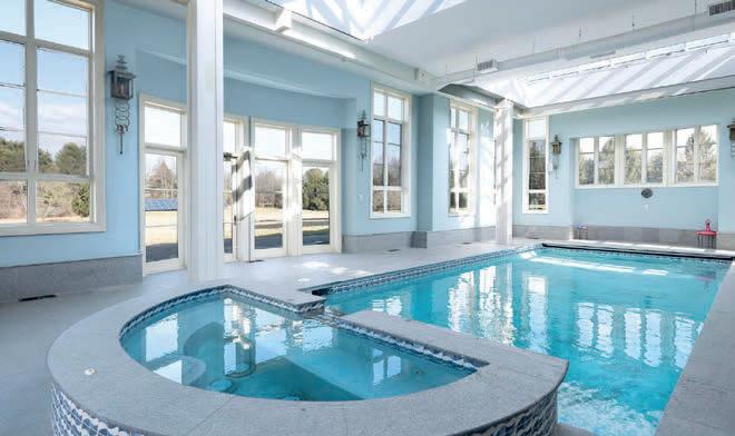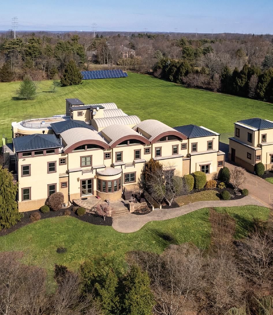 | $4,400,000. This elegant, luxurious East-facing home is one-of-a-kind. Custom built, every detail has been thoughtfully considered and selected including a main floor ensuite for friends and family. Set on a picturesque 7.28 acres in Dey Farm Estates, this house spans 11,226 square feet (source: the West Windsor tax assessor) across 5 bedrooms, 7 full and 3 half bathrooms. Guests will be awed and delighted by the expansive floor plan, the impressive bar with modern spiral gas fireplace, and the magnificent entryway featuring a butterfly staircase. An elevator spanning from the finished basement to the rooftop deck makes for easy living. Final touches on this perfect home include a game room and a meditation room/ office with telescoping glass doors. The oversized gourmet kitchen is sure to delight even the most discerning chef, with top-of-the-line appliances and a huge walk-in pantry. The house features an indoor saltwater lap pool with spa, heated quarried stone floors and Brazilian cherry wood floors. Other highlights include an oversized homeowner’s incredible luxury suite, a separate guest wing, a rooftop deck complete with kitchen and powder room, balconies with amazing views, attached 2 car garage with a second detached 2 car garage, patio and incredible exterior landscaping and fountain. State-of-the-art 6-zone heating and cooling are powered by geothermal technology and a solar field covers the electricity. This home truly has it all.