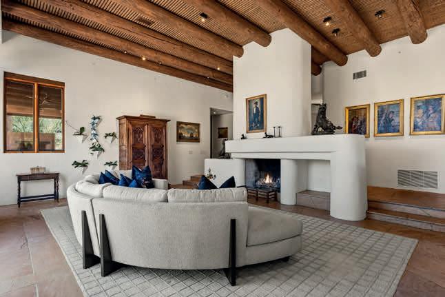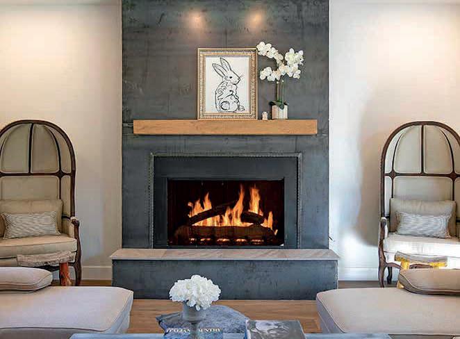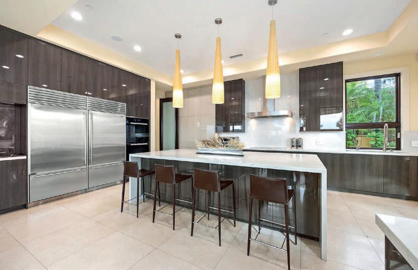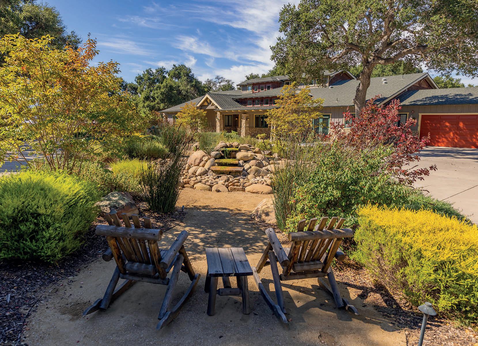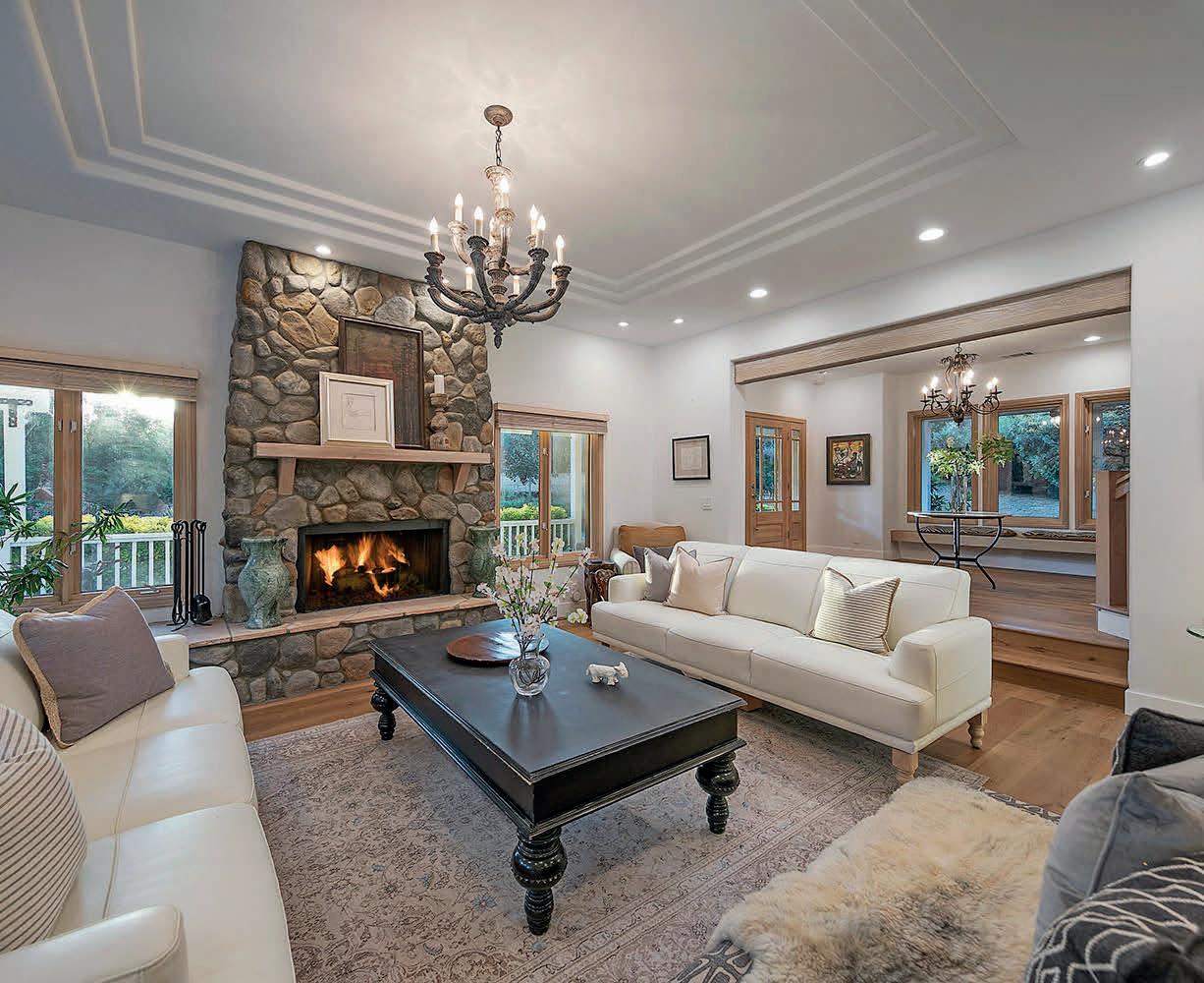 The house’s immaculate outdoor spaces include an outdoor kitchen, a fireplace, multiple fire pits, and an in-ground pool and spa. The treecovered yard adds to the overall sense of privacy, providing ample areas for hosting family and friends.