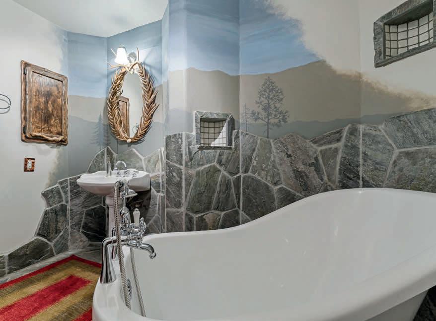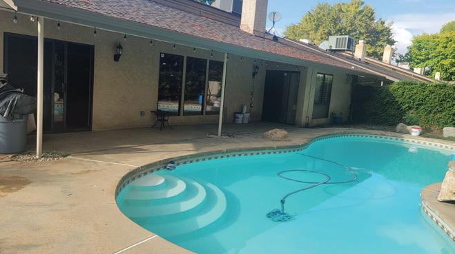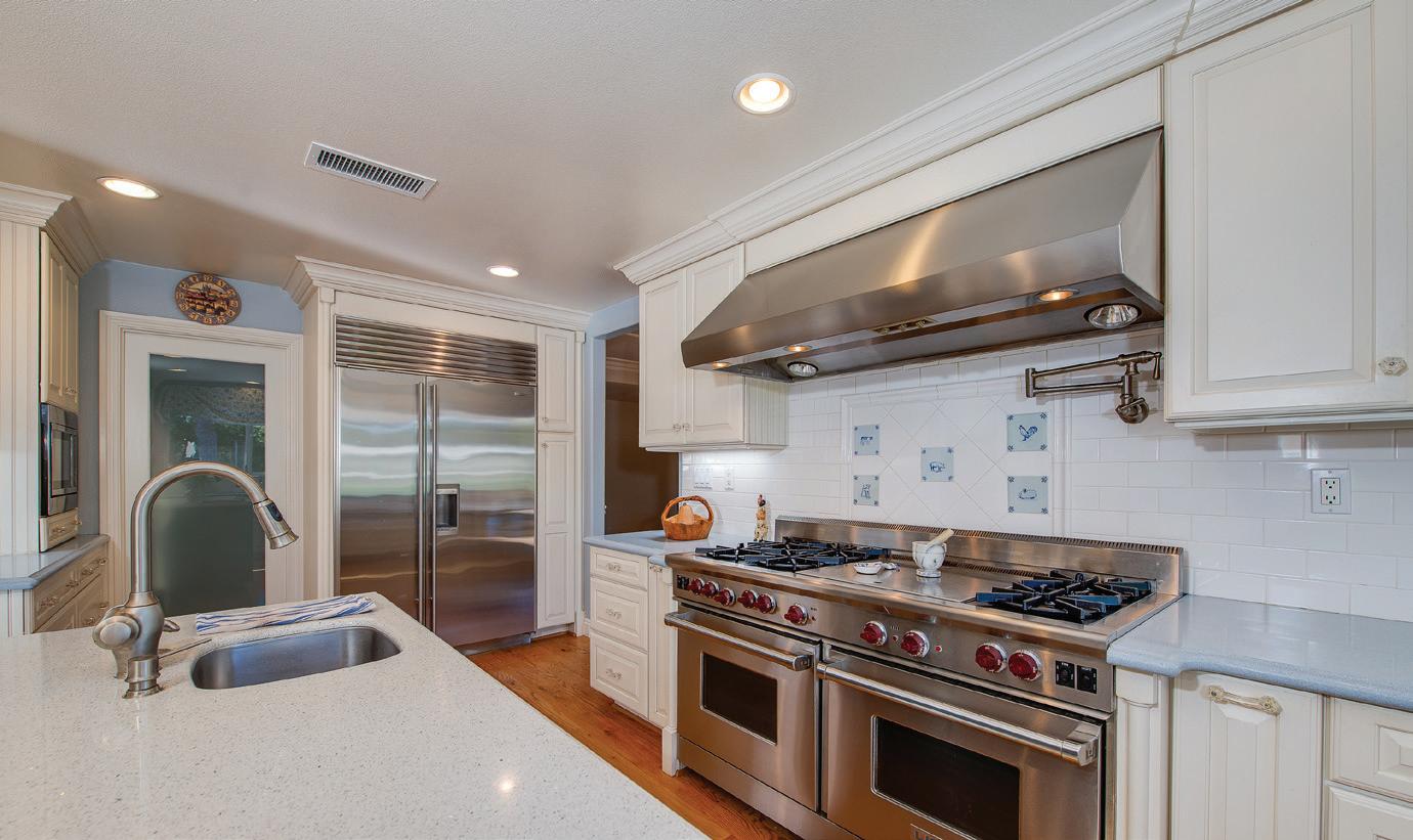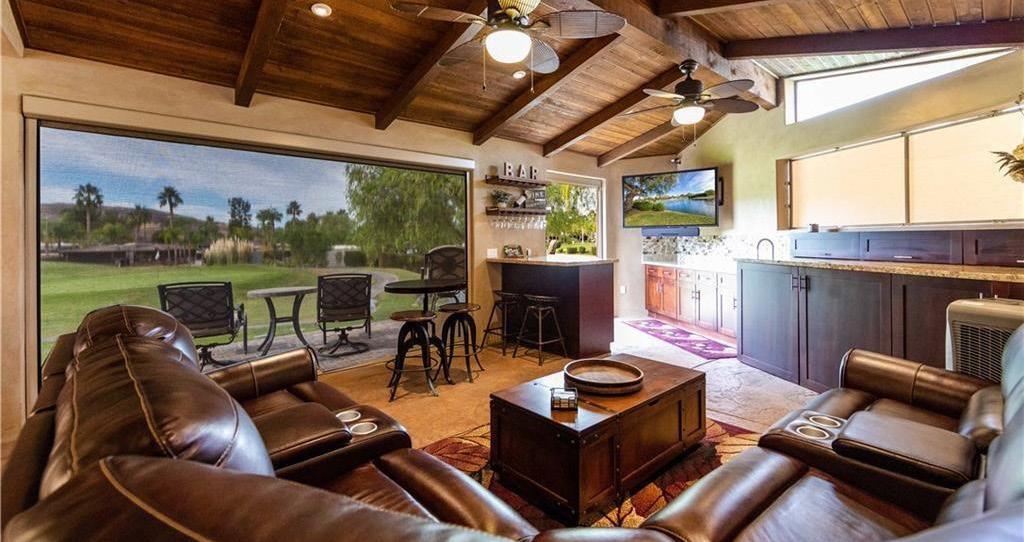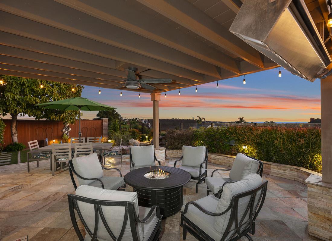 The house’s immaculate outdoor spaces include an outdoor kitchen, a fireplace, multiple fire pits, and an in-ground pool and spa. The treecovered yard adds to the overall sense of privacy, providing ample areas for hosting family and friends.