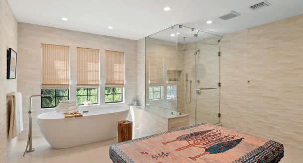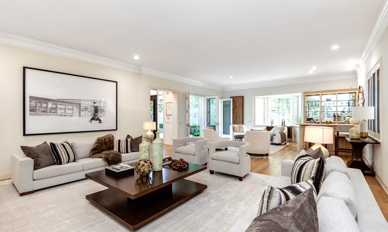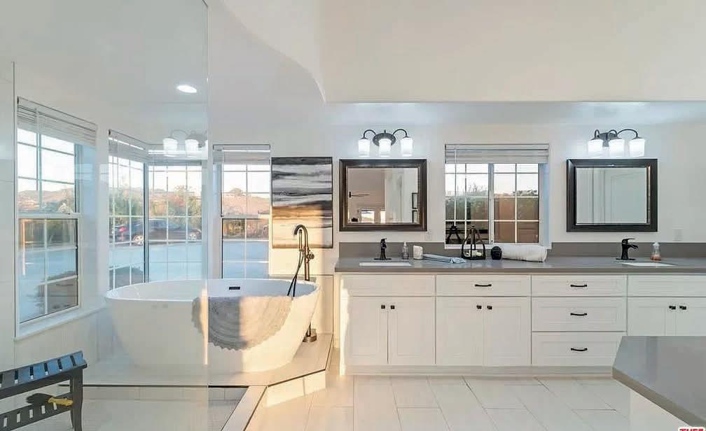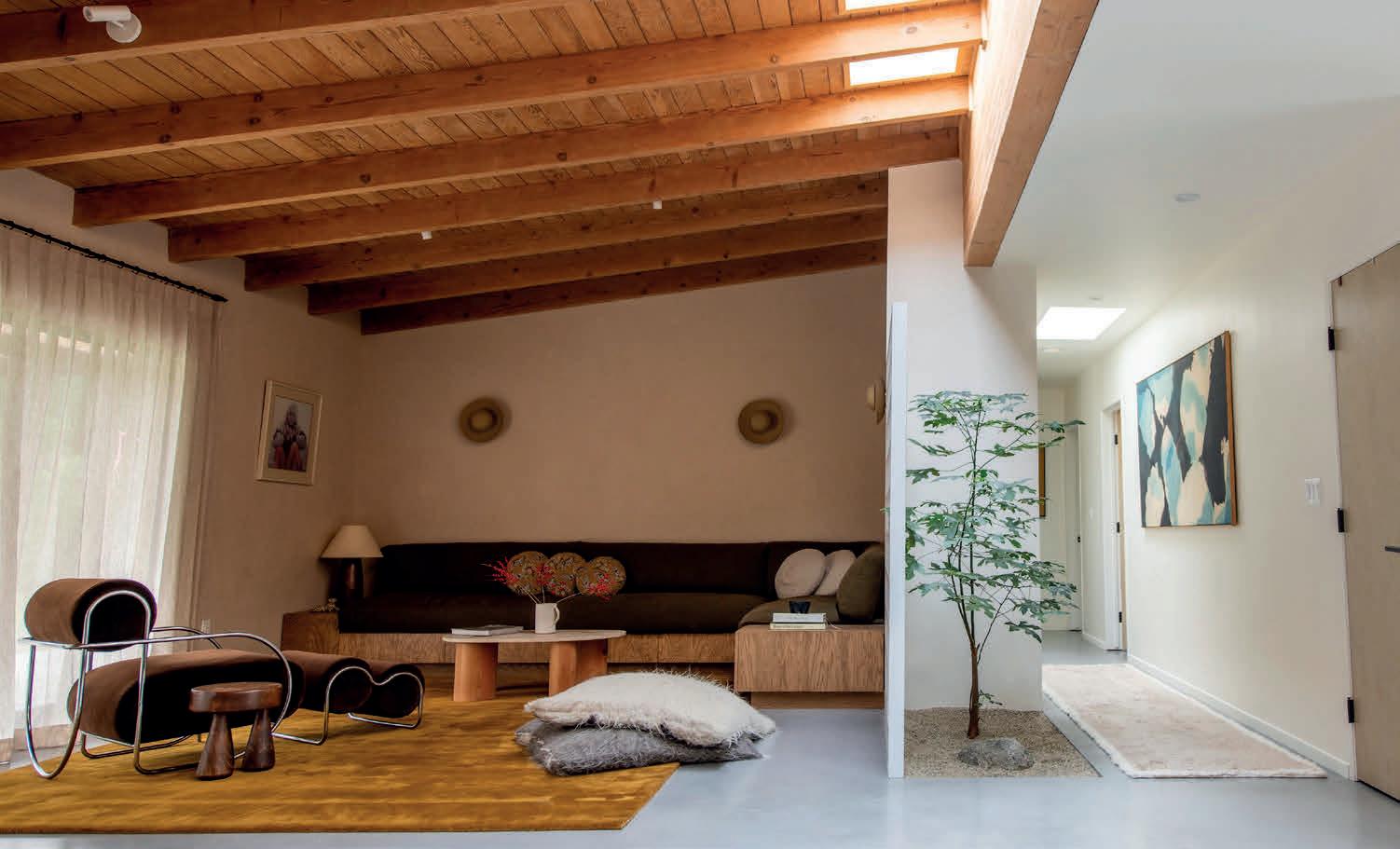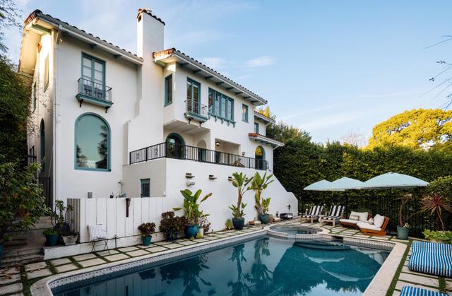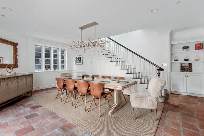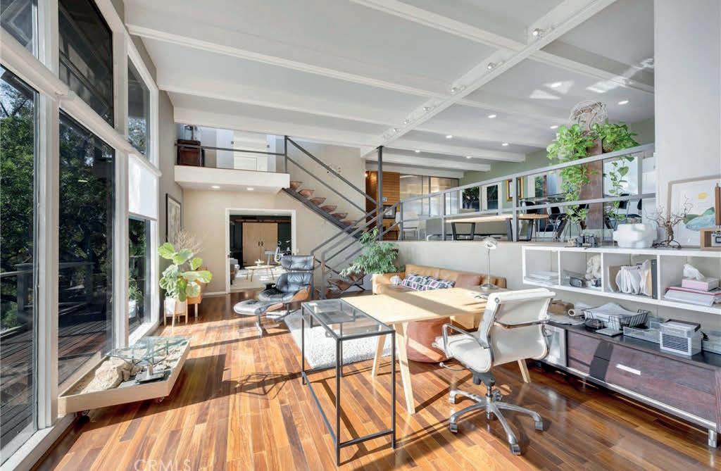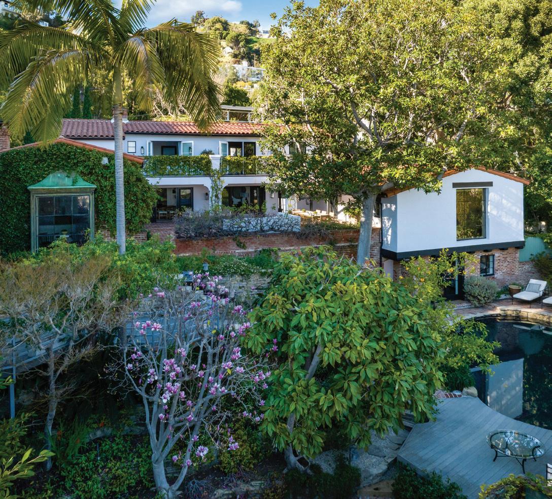 “Nestled in the Hollywood Hills, the home is a beautiful, serene compound that is incredibly private. From the long driveway to the lush greenery, you are surrounded in tranquility and yet in the center of a massive city, and a five-minute drive to Sunset Boulevard,” said Rainy Kerwin. Comprising five bedrooms and six bathrooms, the gated property sprawls over a meticulously landscaped half-acre. Its high-end features include a screening room, a renovated cottage/creative space, and a carport with an EV charger. The home’s interior showcases hardwood flooring, exquisite crown molding, and high vaulted ceilings throughout, imparting a timeless appeal.