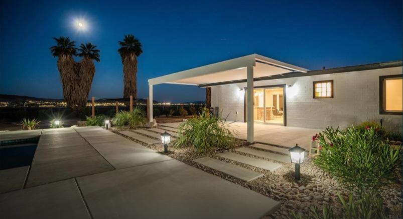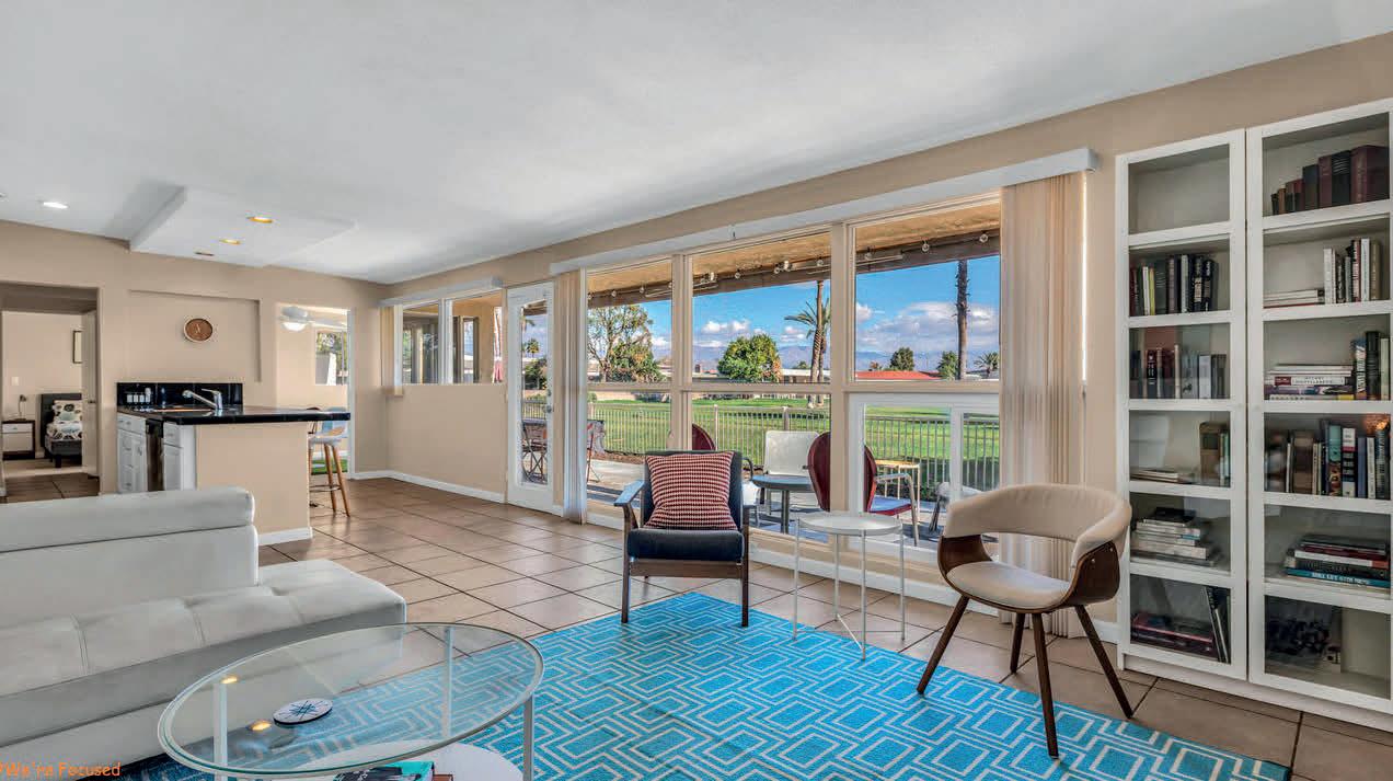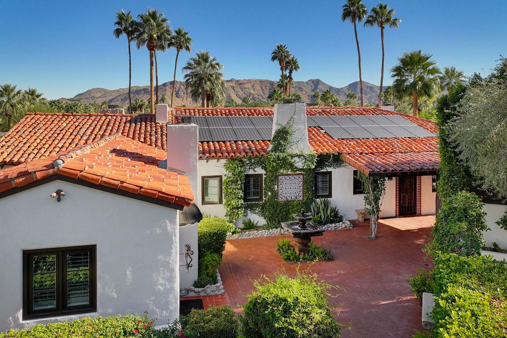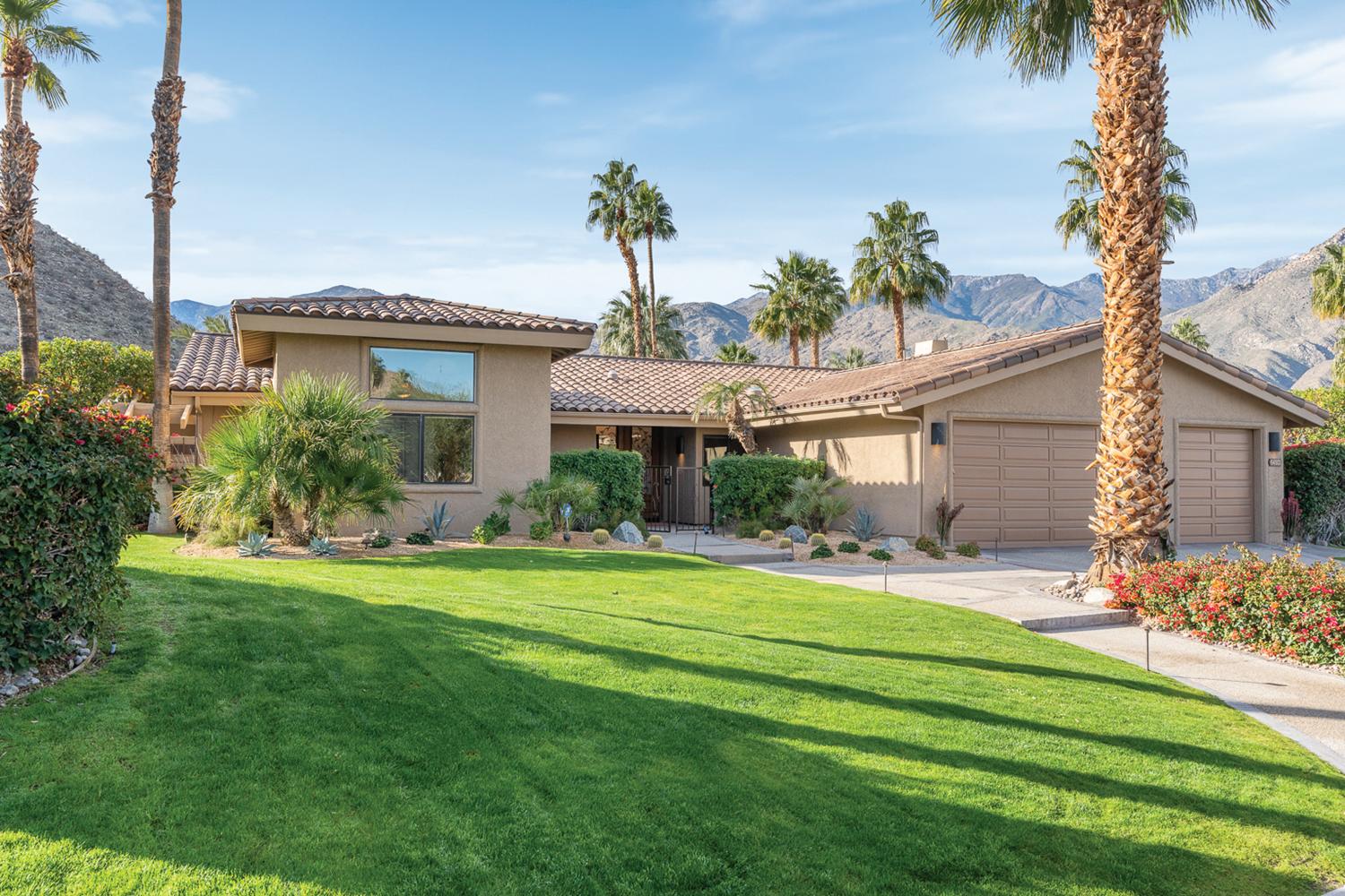 Excellent Fixer Opportunity! Probate Sale. Sold “As-Is” in current condition. Expansive 1965 Alexander Built Mid-Century with owned Solar and Big Views front and back offers 3BR/2BA plus a Media Room or Bedroom #4 with remote control shades and office alcove. Prime South Palm Springs location situated on the golf course in the quiet pocket neighborhood of Tahquitz Creek Golf. Low maintenance artificial front lawn turf enhancing the curb appeal and quintessential Mid-Century architecture, Solar panels ensuring low electric bills, beautiful Travertine flooring, dual pane windows and sliders, tankless water heater, plantation shutters help to keep it cool in summer, ceiling fans, recessed lighting. Open four-sided Fireplace complements the Dining Room and Living Room with Mountain Views. Huge Primary Bedroom features just under 600 sq ft of comfort with stone Fireplace, wall-length mirrored closet, and AC mini split. Two-Car Garage. No HOA on land you own.