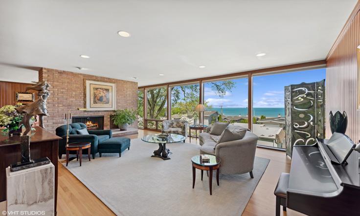 AMAZING LAKE MICHIGAN VIEWS FROM THIS MID-CENTURY MODERN HOME WHERE EVERY DETAIL HAS BEEN THOUGHT OUT! On the main level, you will notice the large windows in the livingroom with endless lake views, the hardwood floors, & brick fireplace separating living and dining space. The large, custom kitchen has Wood Mode/Brookhaven soft-close cabinets w/pull-out shelves, full extension drawers, & plug molding under island & cabinets, & high-end appliances. There’s also a half bath & lakeview 3-season porch. Down the skylit hall, you will find lakeside guest rooms, office and the master suite complete with 2 walk-in closets, separate shower and whirlpool tub with private patio and guest bath. The lower level has a 4th bedroom with built-ins, a media room with projector, screen, & room-darkening shades, workout room, bath, laundry room, & storage. The garage has tiled floor, built-in cabinets w/sink & storage system. The beautifully landscaped yard has sprinkler system for ease of watering.
