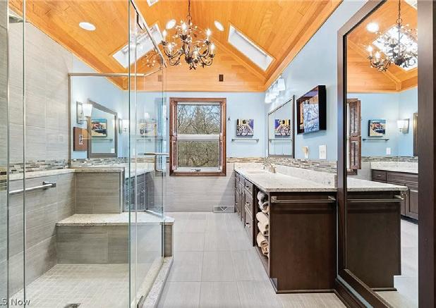 Incredible Lake Erie front custom Hm. with Downtown Cleve. view-Custom designed by Paskevich & Asso.-This 7618 sq.ft. Stone & Cedar Country French Hm. Has 4 bedrooms with the possibility for 6, 5 full bathroom and 3 half bathrooms-Possible in-law suit if needed-Large kitchen with high end appliances All generous size rm. thru-out with Lake Erie view. Amenities include / All floors including EXTRA Large 4 car garage have ZONED IN-FLOOR RADIANT HEAT/ PLUS Total DRIVEWAY HAS RADIANT ICE MELT / 4 STOP ELEVATOR / Finished Rec rm w/ Bar & Fireplace / Private observation rm./ Large great room with custom wainscoting paneling thru-out /Private office with full bath & private entrance/Gazebo / Whole house Generator / Newer boilers / PLUS A/C / Large out building for storage / PLUS ADJACENT LOT 60 X 178 INCLUDED WITH PURCHASE. TOTAL TAXES INCLUDES ADJACENT LOT