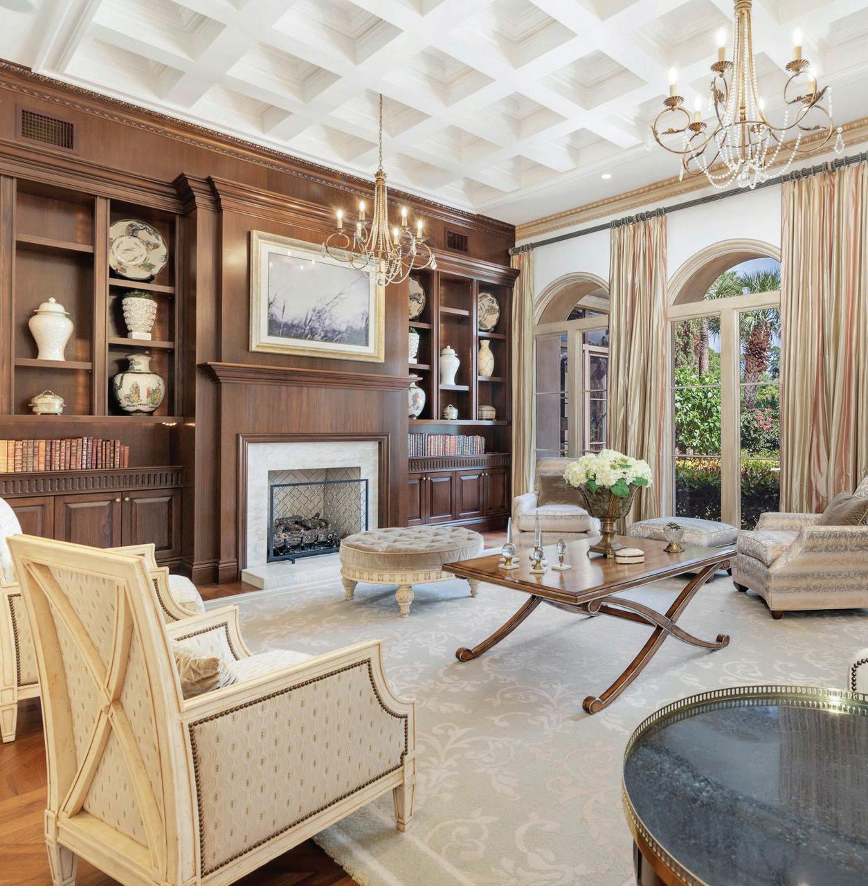 The cove dining room stands as a masterpiece in design, with its vaulted, tongue-in-groove, and beamed ceiling, offering an elegant space to gather and entertain. All woodwork throughout this estate was carefully crafted by Palm Beach Woodwork Company. Ascend the captivating stone spiral staircase to the second floor, where an additional sitting room awaits, providing an equally enchanting vantage point to admire the surroundings.