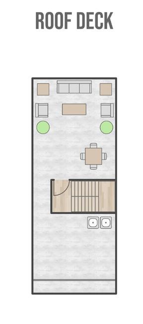 off kitchen (2nd floor), and deck off primary bedroom (4th floor)