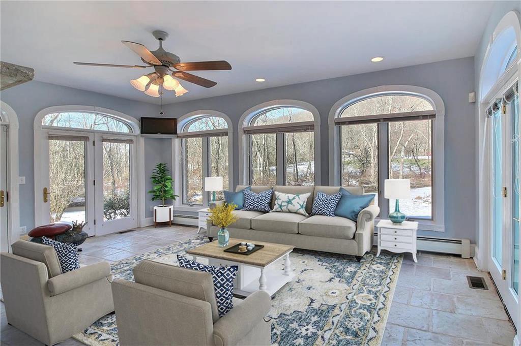Custom built with fieldstone exterior and copper accents, this 6,274± sq ft residence is sited amidst 33.8 acres of fertile fields, lush meadows, woodlands, and panoramic sunrises and sunsets. A bluestone walkway leads to the covered front porch, where pastoral views and an occasional hot air balloon from the nearby airport are visible. The grand 2-story foyer with transom windows, extensive woodwork, and a curved staircase sets high expectations upon entering. Sensational views from every window provide the backdrop for gracious entertaining and casual living. This intimate setting abuts scenic High Rocks State Park. Nearby farmers markets, orchards, polo in the summer- it's all so close!
