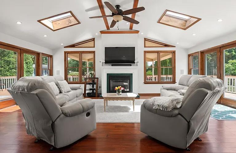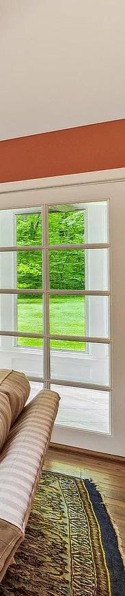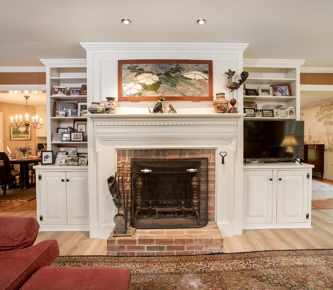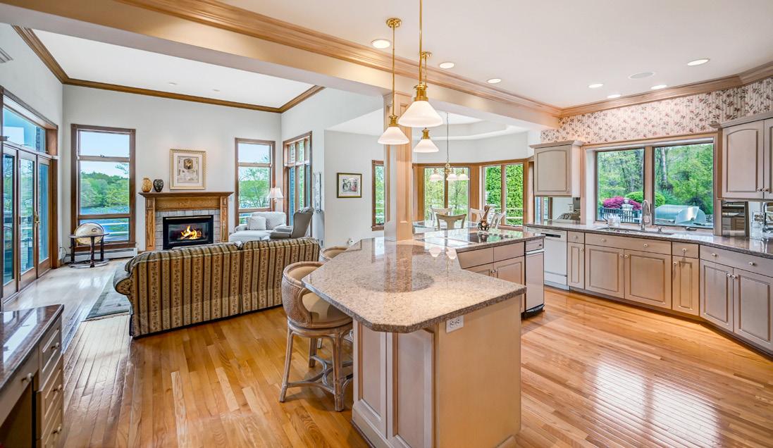 This great room overlooks the bluestone patio to enjoy the grounds and white picket fenced yard.