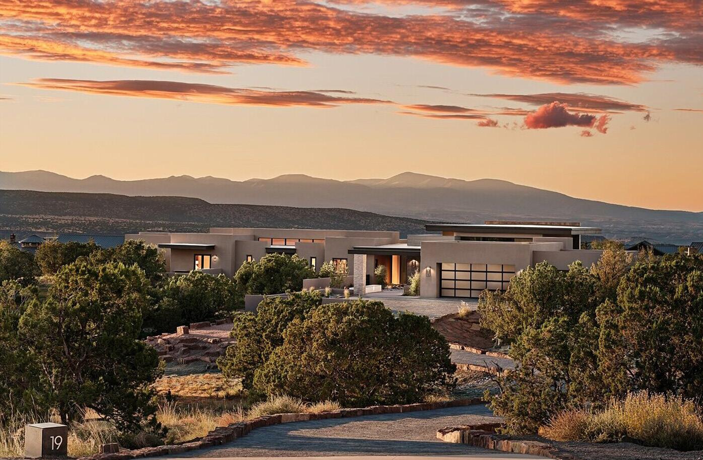 Stunning, modern Contemporary located in a gated area of Las Campanas. Designed by the esteemed collaboration of Archaeo Architects & Prull Custom Builders, this architectural marvel redefines luxury living blending upscale conveniences with natural elements. Guests are greeted with a zinc-clad entry adorned with a customized black walnut door setting the tone for exquisite craftsmanship throughout. The foyer transitions into the expansive great room where floor-to-ceiling porcelain tiled walls frame an inviting 8-foot open biofuel fireplace. Large glass panels & clearstory windows seamlessly blend indoor & outdoor spaces with postcard views of the Sangre de Cristo & Jemez mountains. The epicurean kitchen boasts a stacked stone wall, granite & Silestone countertops, top-tier appliances & a breakfast nook. Conveniently near the kitchen, a walk-in pantry, storage area & mudroom as you move toward an oversized 3-car garage with workshop. Media room, library/office, 2 spa-like guest suites. A hot tub is accessed from the private, luxurious glass enclosed owner’s suite offering a serene retreat. Enter this spectacular residence on a stone-lined driveway adorned with hand-placed pavers with a professionally landscaped motor court. Outdoor entertaining areas have enclosed courtyards with water features & a firepit. Situated on 2.3 acres with a pre-designed area for a casita. sothebysrealty.com/id/TJR6LJ