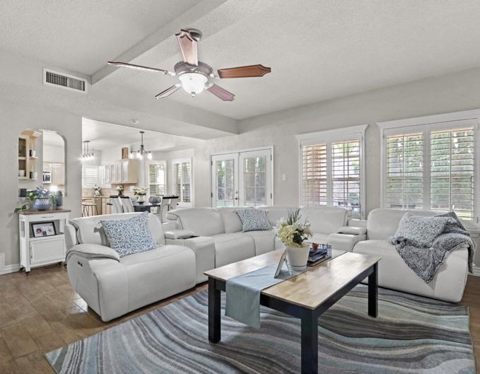The open concept kitchen, large walk-in pantry, breakfast area & family room with wood burning fireplace are perfect for entertaining! The half bath is conveniently located in the hallway between the formal dining area & kitchen. The downstairs office has a closet and could be utilized as a 4th bedroom. The upstairs features 2 bedrooms, jack-n-jill bathroom & a craft room that could be utilized as a second office or additional storage. Walk-in attic access as well! The utility room is located near the entry/exit door that leads out to the 2-car oversized, insulated garage. The covered patio area is perfect for cookouts and hanging out! The well-manicured backyard can be accessed via the large doors in the living room that swing completely open creating an indoor/outdoor space, the garage access door or the exterior gate near the garage. The patio furniture and mounted exterior tv stays!