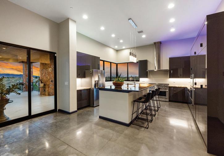 of sleek, clean lines & features, floor-to-ceiling windows - 6 panel retractable door system that opens & disappears into the wall connecting indoor & outdoor living areas. Panoramic views of several greens, fairways & Mountain ranges. Interior features: 26ft high ceilings in great room, polished concrete floors, chef’s dream kitchen w/retractable windows, custom cabinetry, large island, luxurious master suite, large walk-in closet, double vanity, Jaccuzi tub w/ views, modern finishes, private office, large bonus room, 3 upper decks, expansive ext patio, fenced yard, Custom Lap pool 25 ft x 12 ft w/ spillways & controlled by an app, large garage & much more.